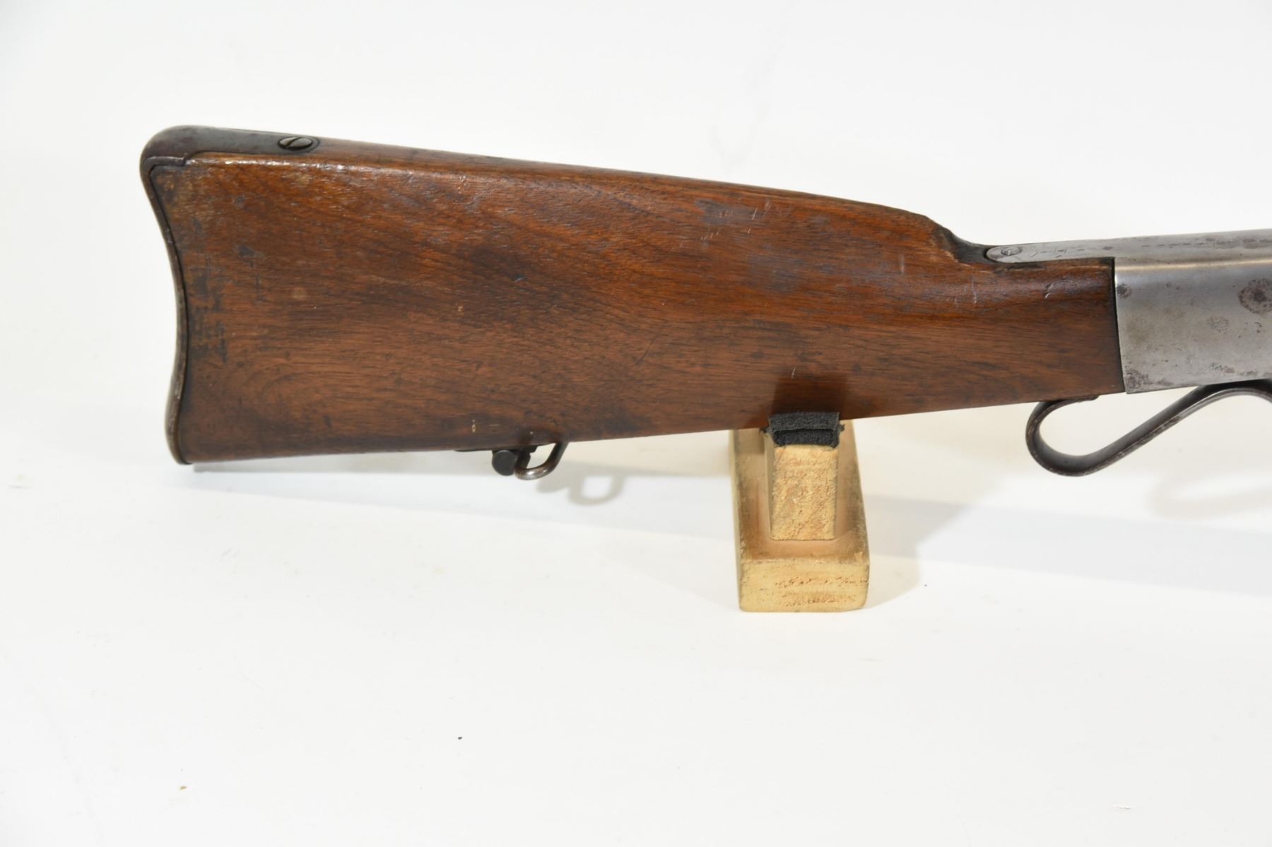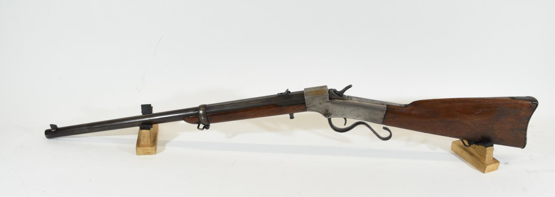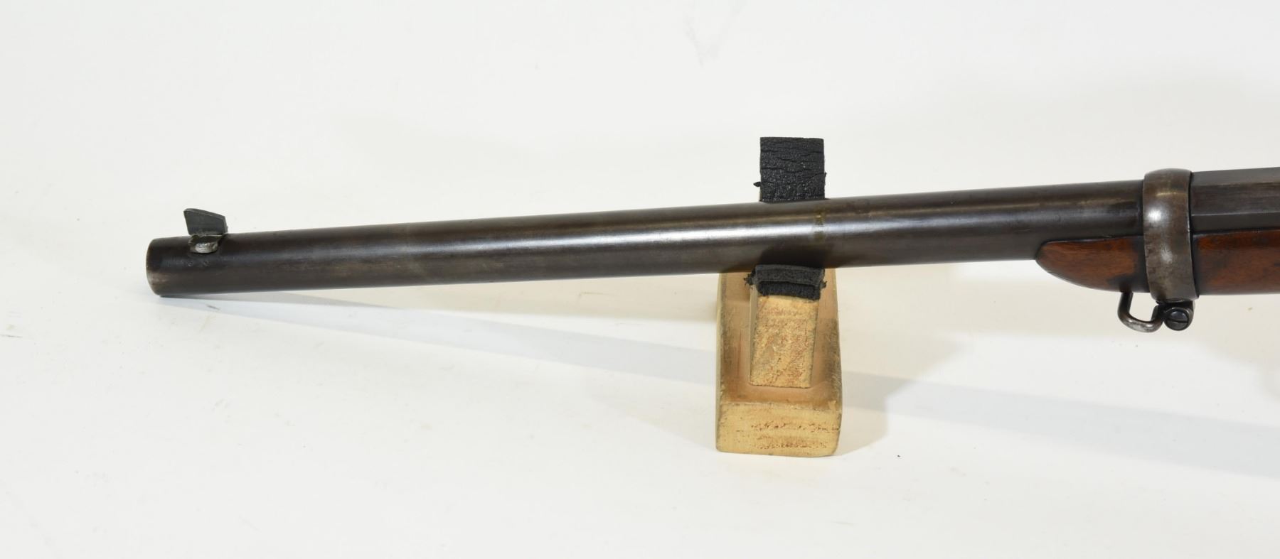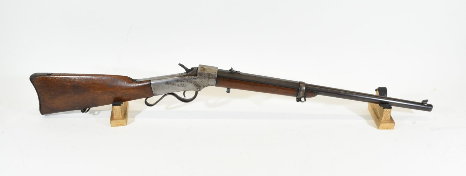 Antique, single shot, 44 RF, 22" octagonal barrel. SN 4806. Wood forearm has a large chip missing, bluing is brown, bore is pitted and rifling prominent. Front sight and tang screw not original. Manufactured by Merwin & Bray Agts, New York.