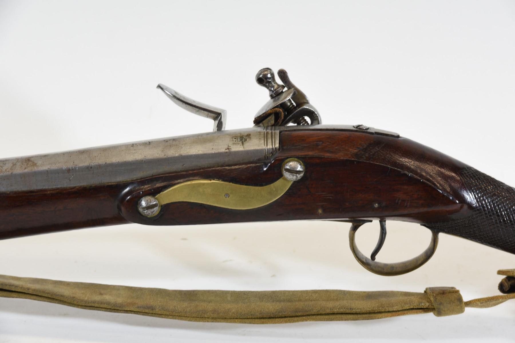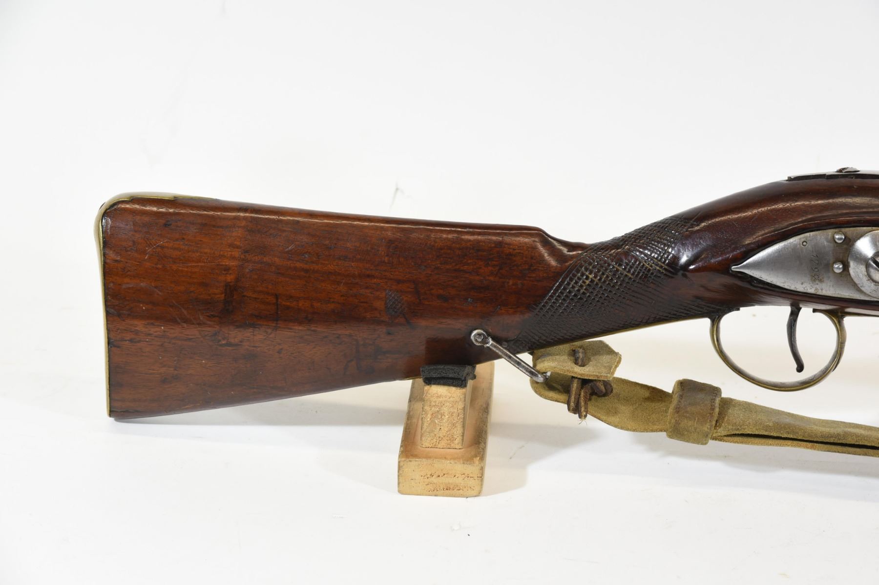 Antique, single shot, flintlock, 14 3/4" barrel. No SN. Wood has dents, repaired chips and a crack, bluing is gone, bore pitted. Date stamped 1797 on lock.