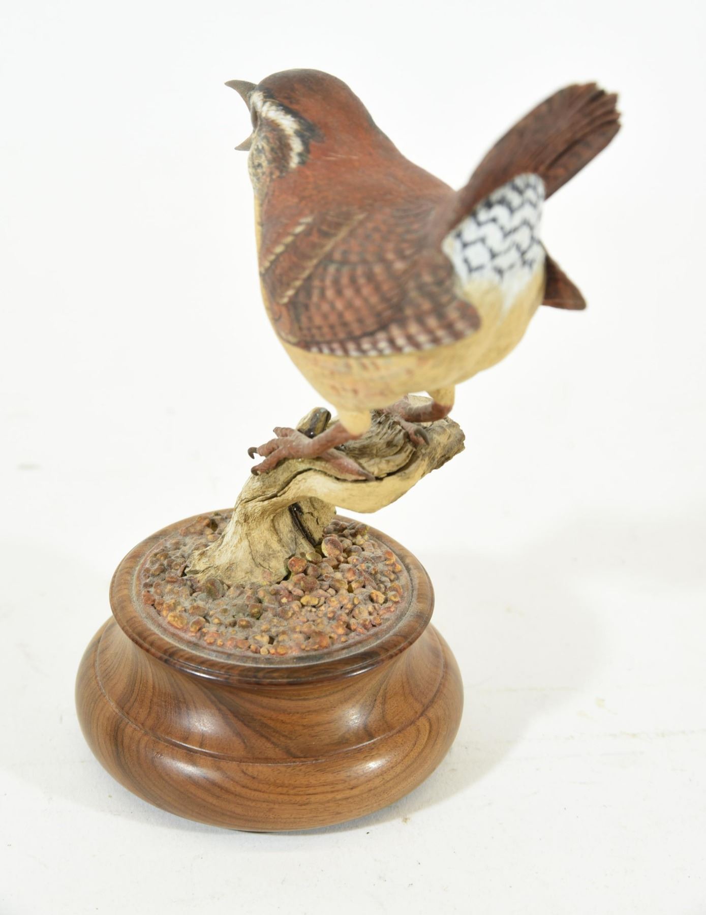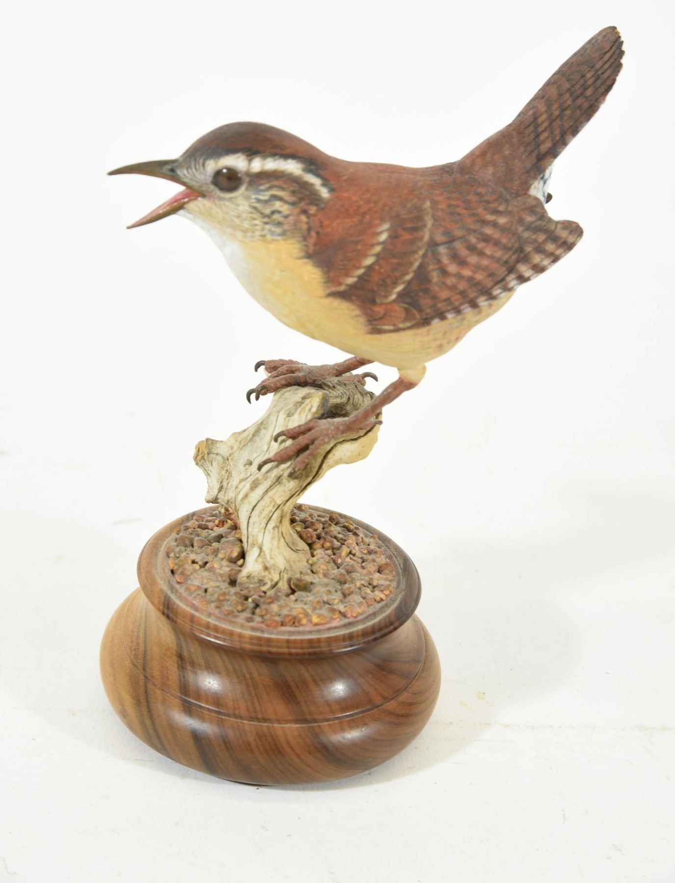 Carved Wren sitting on stick and chirping. Carved by Terry Barkley in 1988. 6 1/2 inches tall.