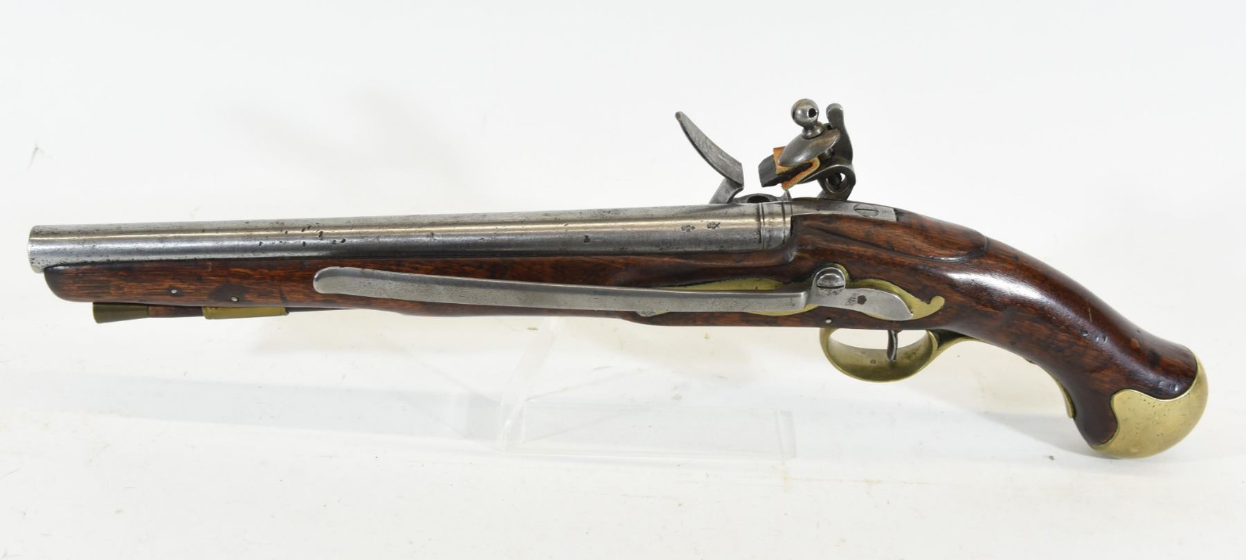 Antique, single shot, 56 cal flintlock, 12" barrel. SN none. Wood has a couple of dents, bluing is completely gone, bore rusty. Tower lock said to be circa 1700.
