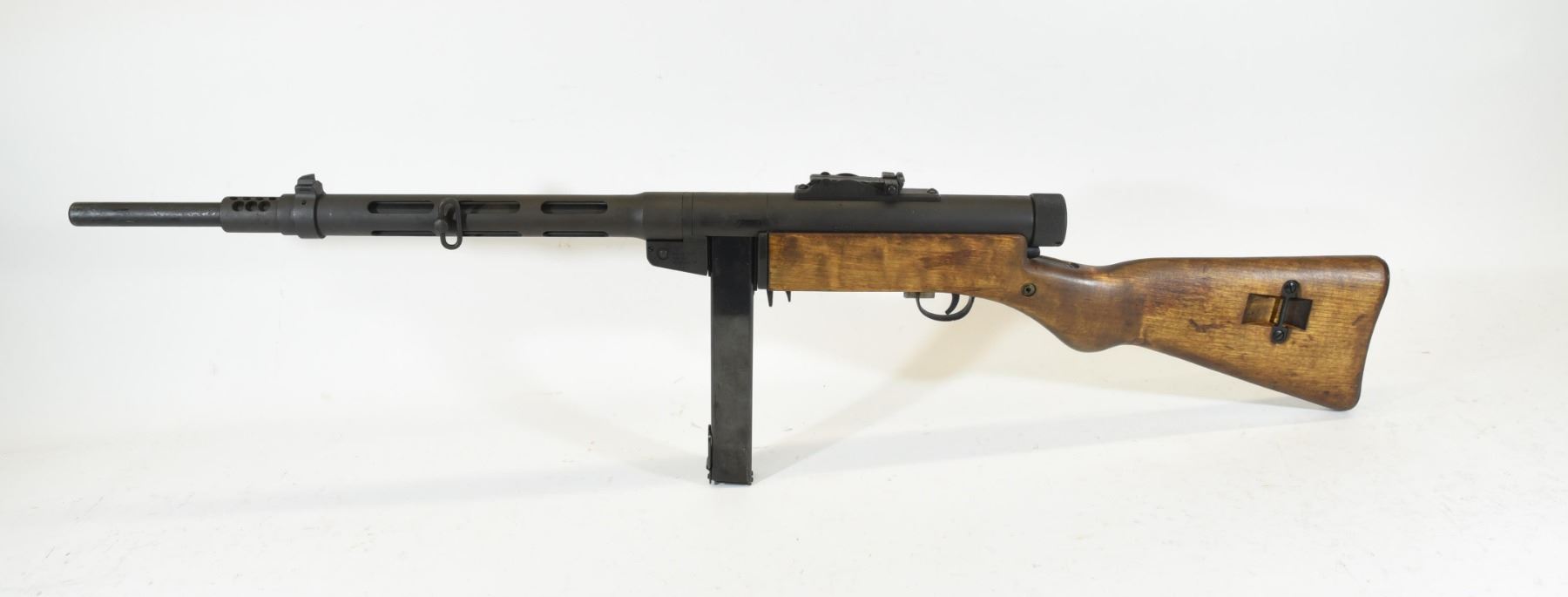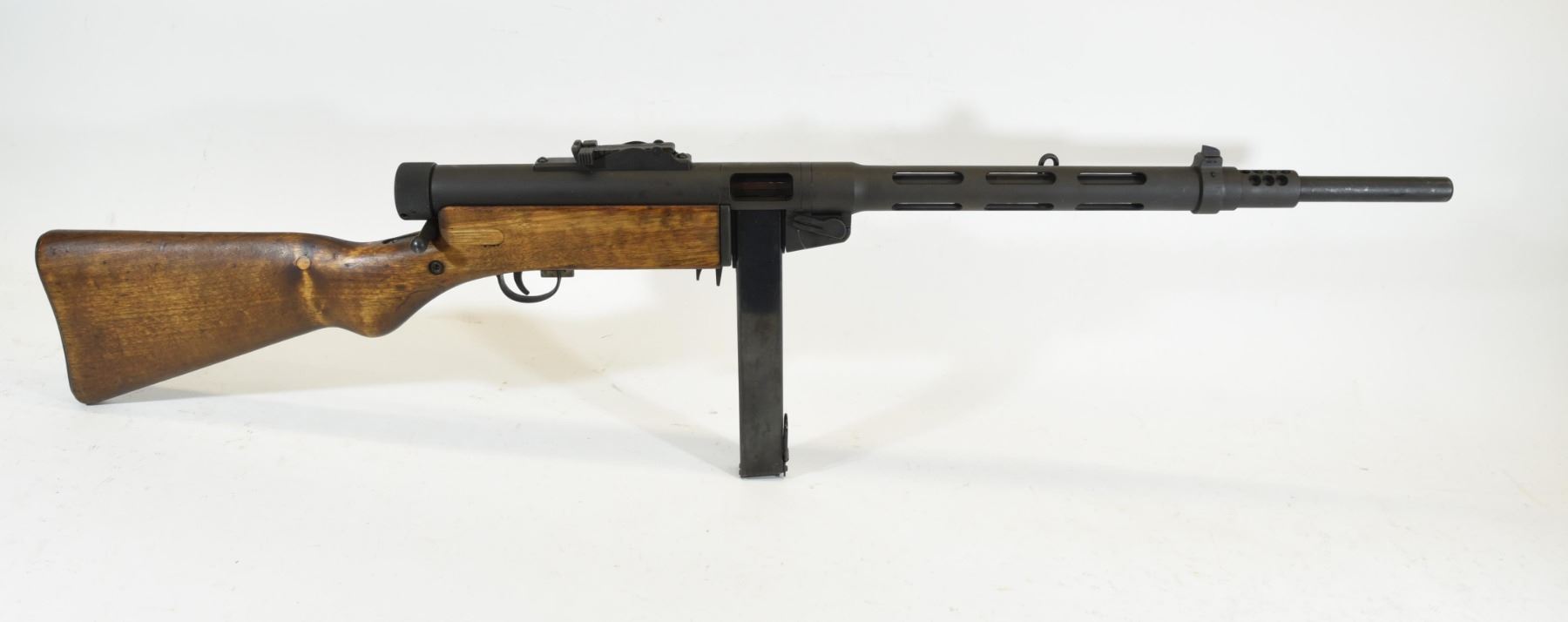 Non-restricted, semi-auto, 9mm Luger, 19" barrel. SN C4254. Wood is in good condition with just a couple of minor dents, bluing is matte and in good condition, bore is very good, mag has been pinned to 5 shots.