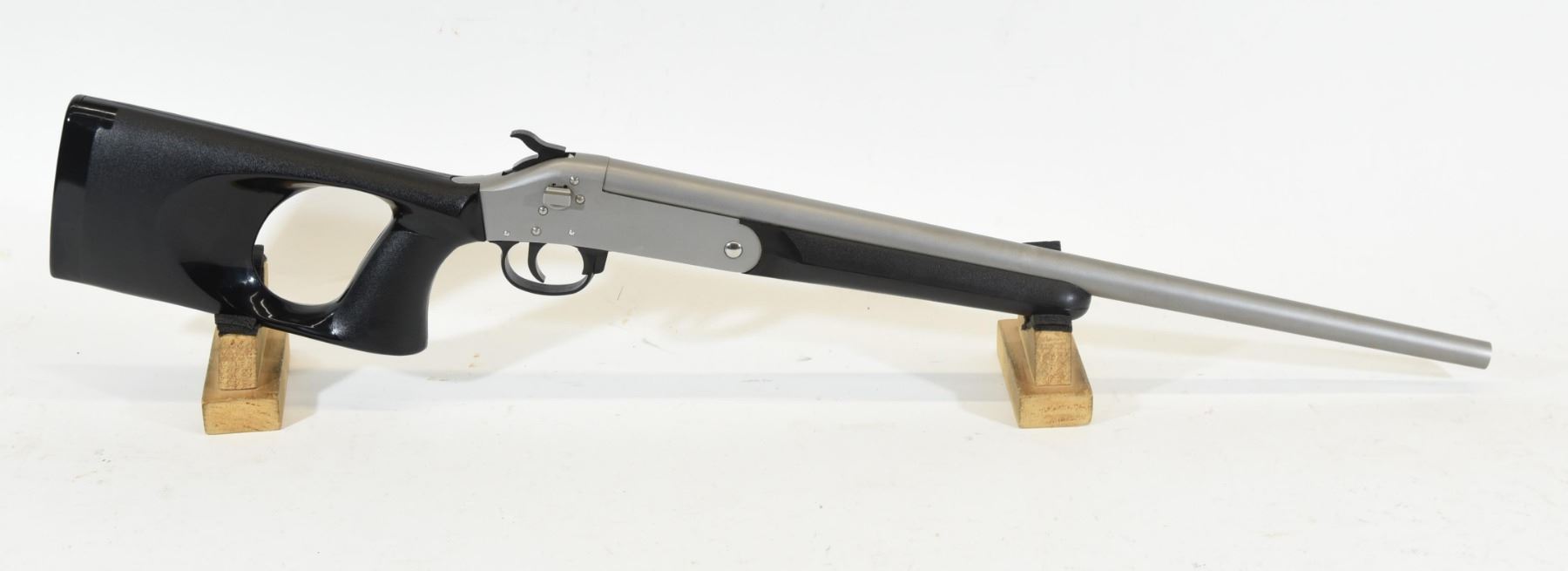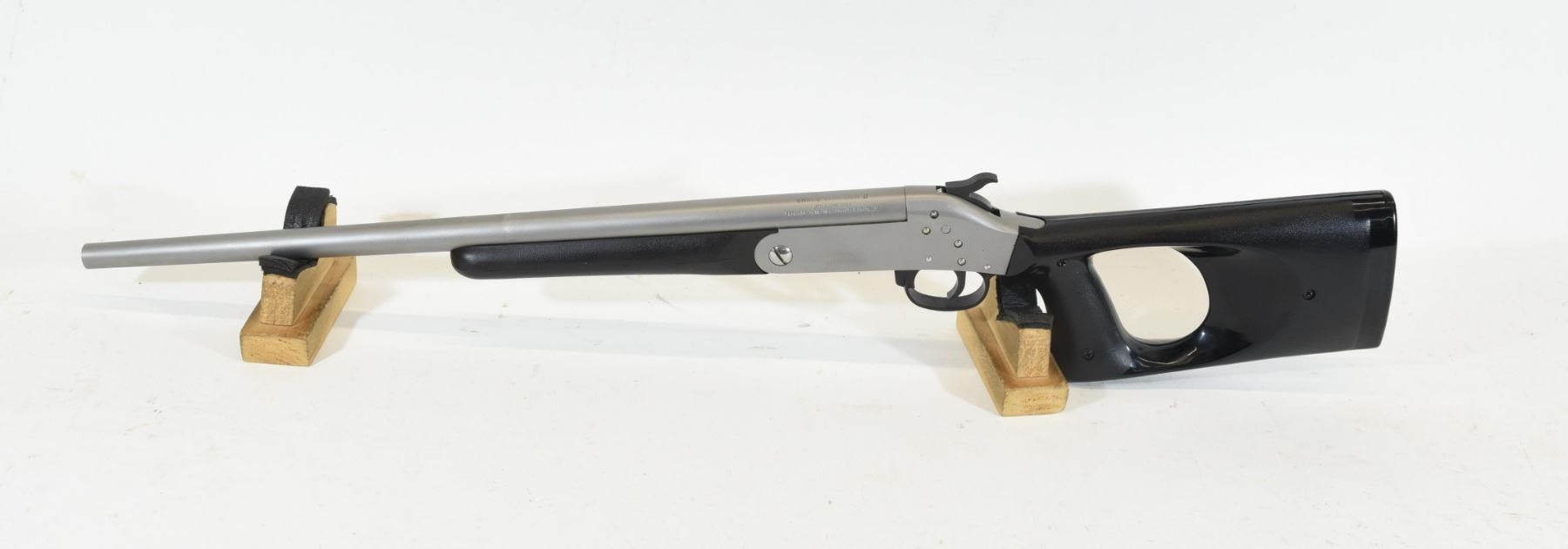 Non-restricted, single shot, 410 ga., 18" barrel. SN 17242. Synthetic stock is excellent, stainless barrel and receiver are excellent, bore is excellent. Original box.
