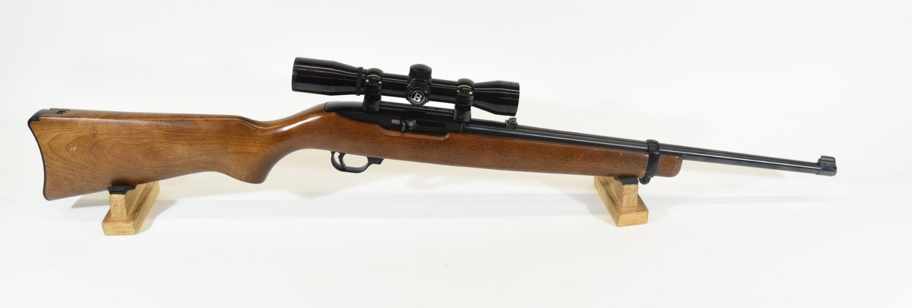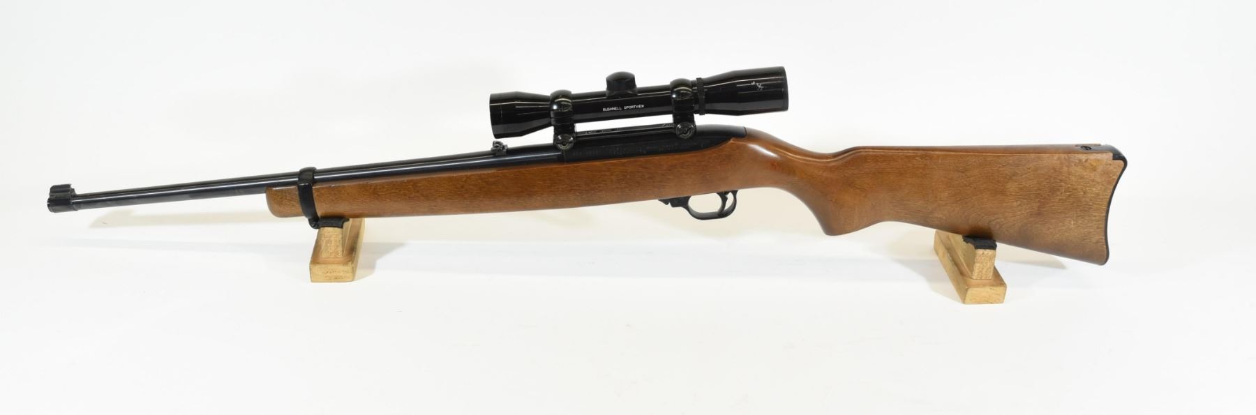 Non-restricted, semi-auto, 22 lr, 19" barrel. SN 232-36337. Wood has a few light scratches and dents, bluing is good with 3 grey spots by muzzle, bore is excellent, comes with a Bushnell sportview scope.