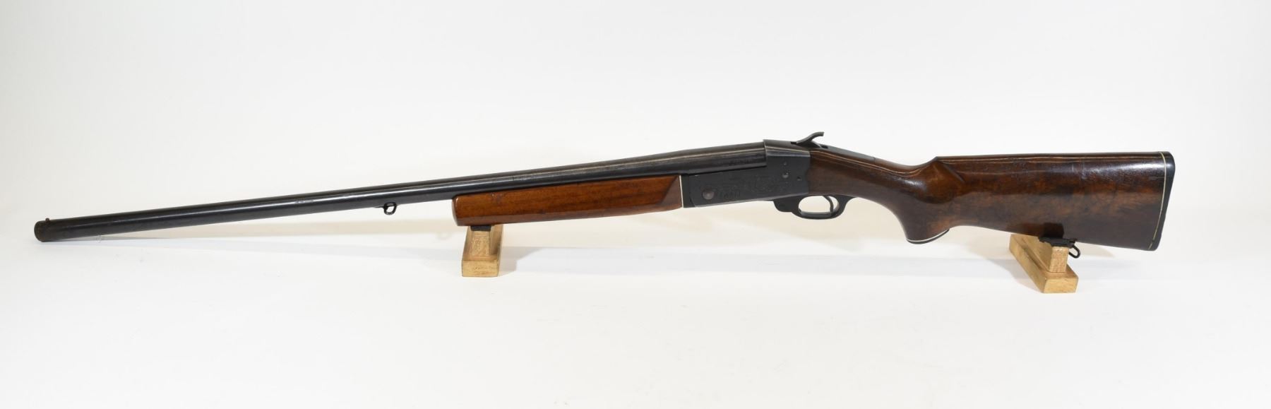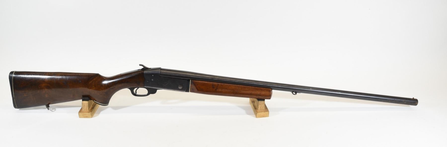 Non-restricted, single shot, 12 ga. 2 3/4", 30" full choke barrel. SN C52805. Wood has light scratches and dents and 2 small cracks by the receiver, bluing has some rust and is starting to turn grey, bore is good.