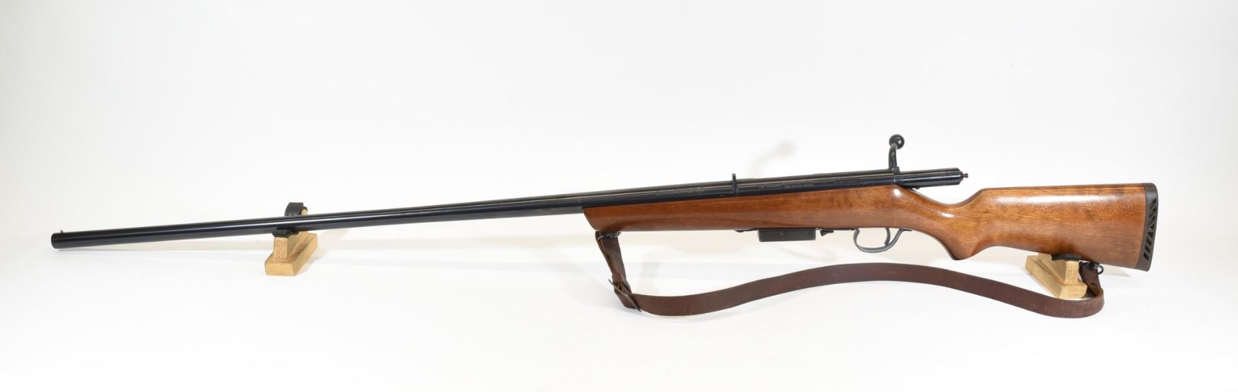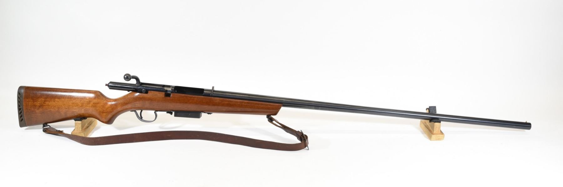 Non-restricted, bolt action, 12 ga. 3", 36" barrel. SN 18743618. Wood is very good with light marks, bluing is very good, bore is very good, comes with leather sling.