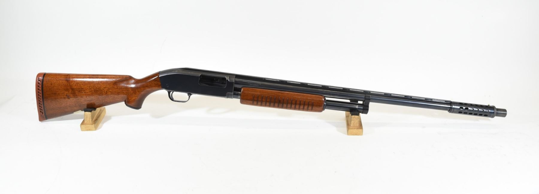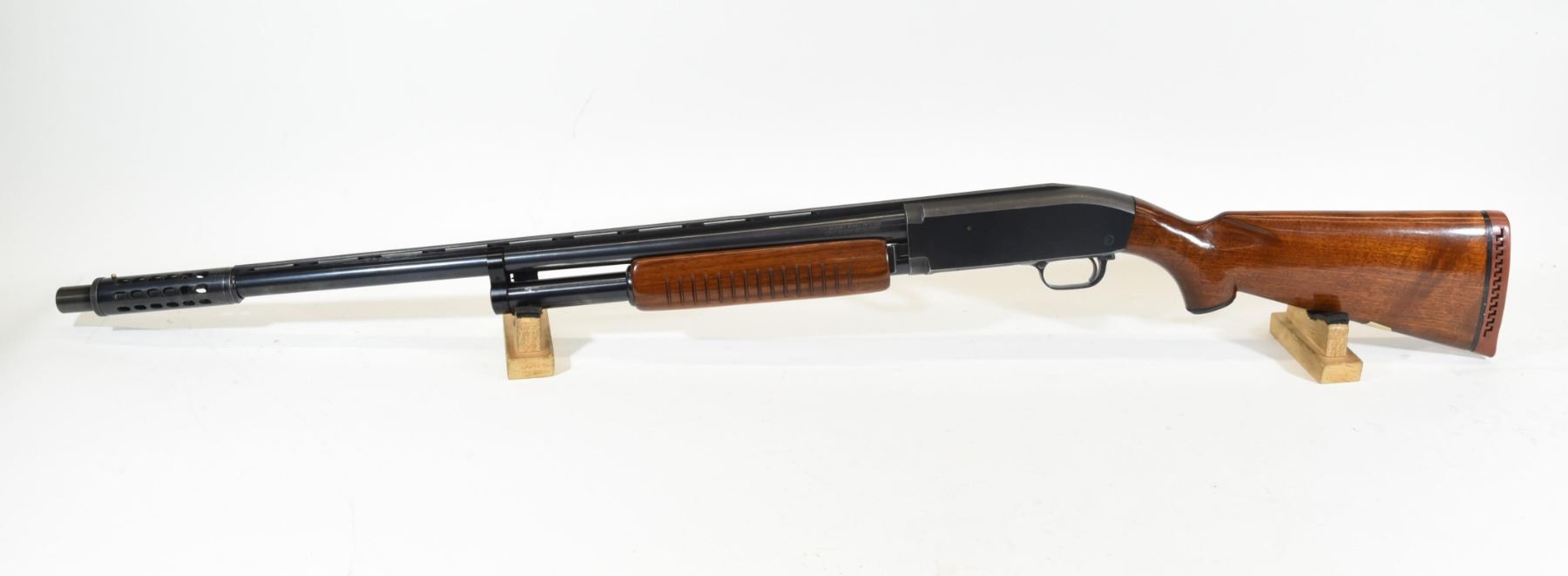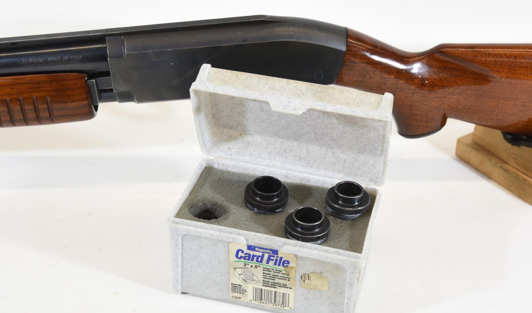 Non-restricted, pump action, 12 ga. 2 3/4", 28" barrel. No SN. Wood has a few dents and light scratches, bluing has just a couple of spots of grey, bore is very good, comes with screw in turkey choke and short, medium and long range chokes.