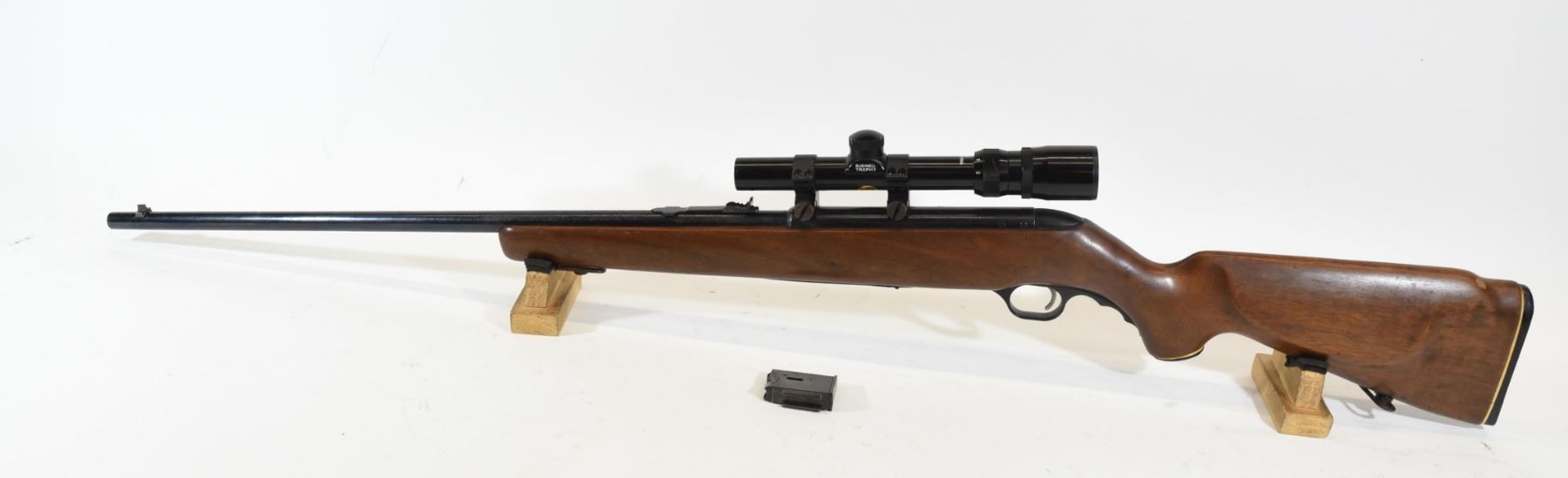 Non-restricted, bolt action, 22 Magnum, 24" barrel, SN none. Wood has scratches and a dent, bluing moderatley pitted all over, bore excellent. Comes with Bushnell Trophy 1.75-5 x 21 wide angle scope.