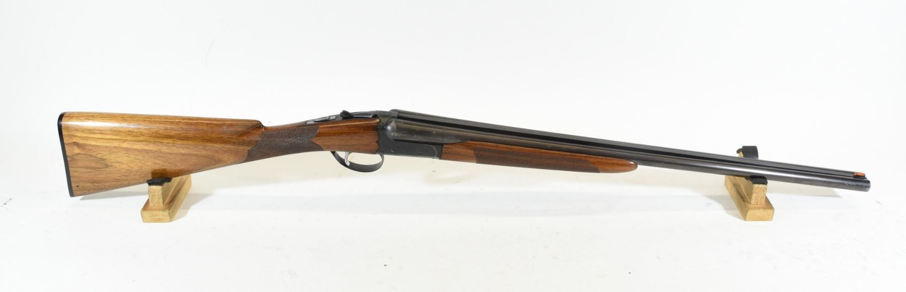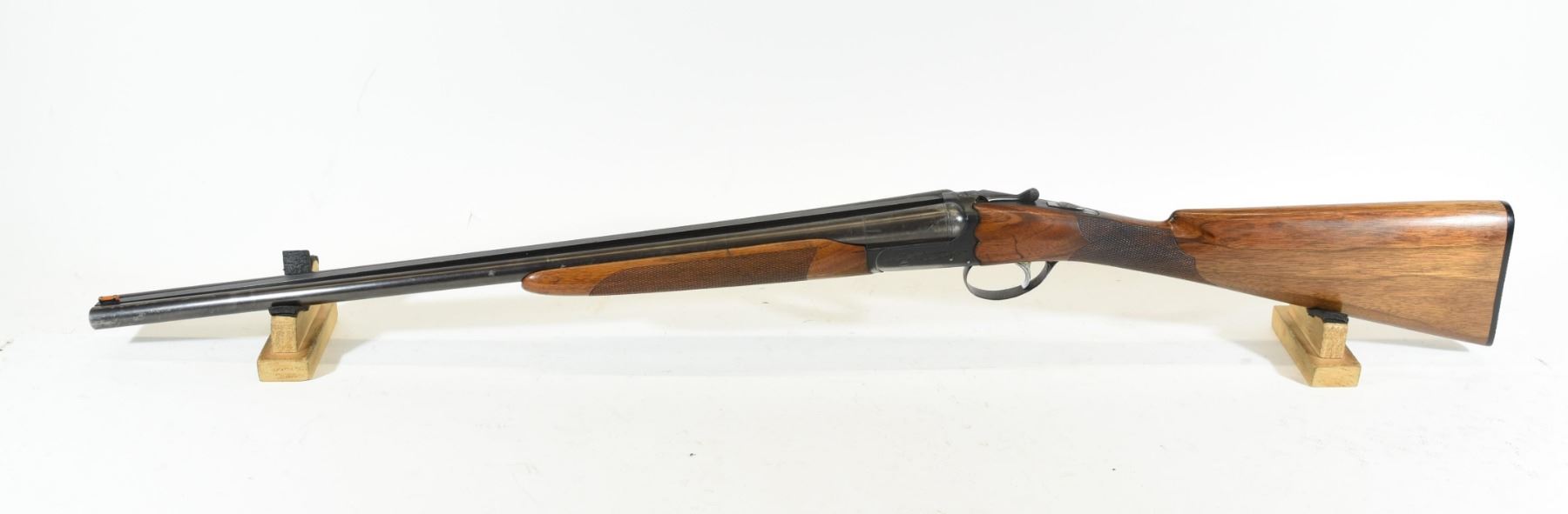 Non-restricted, multi-barrel, 20Ga x 3", 25" barrels with fixed chokes (IC,M). SN S209707. Wood beavertail forearm and custom straight stock have a few marks, bluing is grey with deep marks on the barrels, bores excellent.