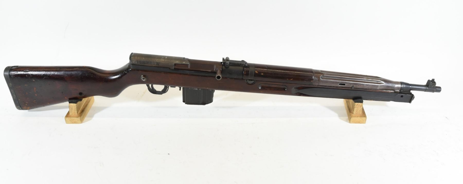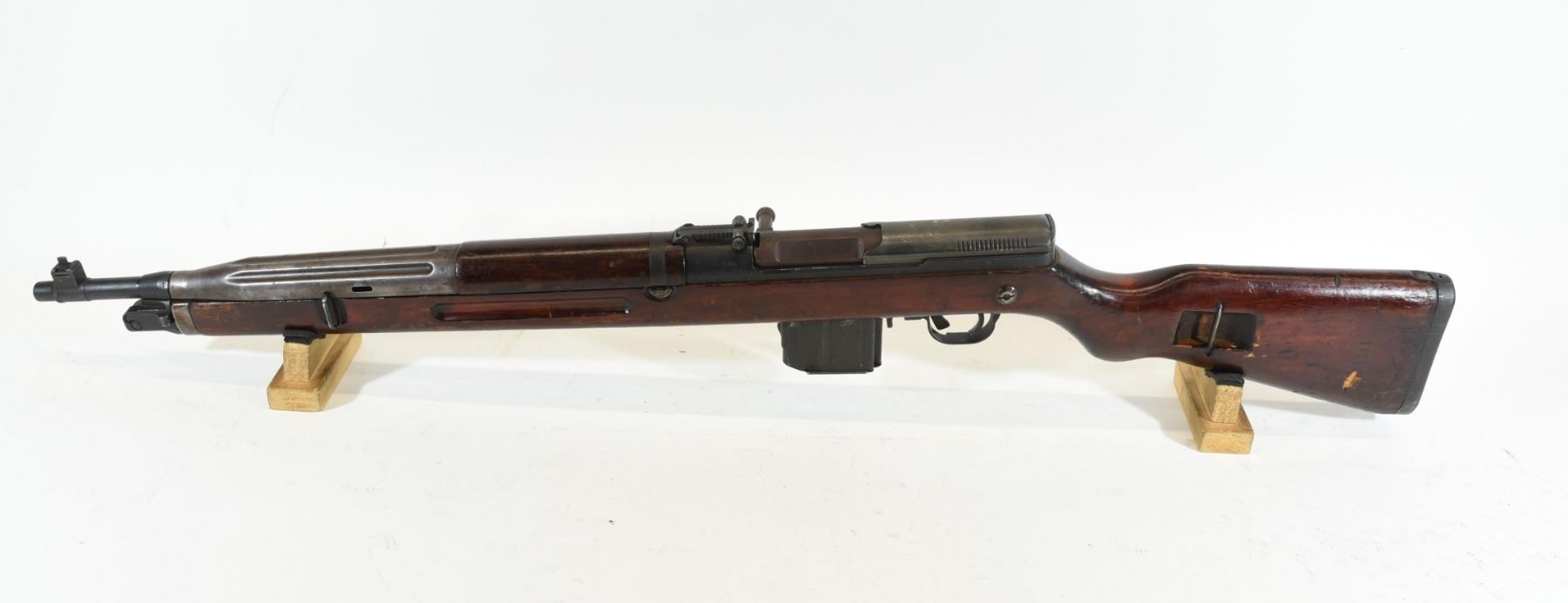 Non-restricted, semi-auto, 7.62 x 45, 20 1/2" barrel. SN G65937. Wood has gouges and dents with numerous marks, bluing turning brown, bore good.