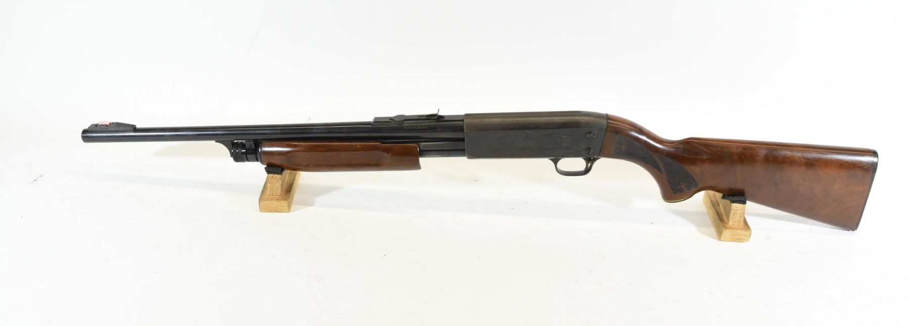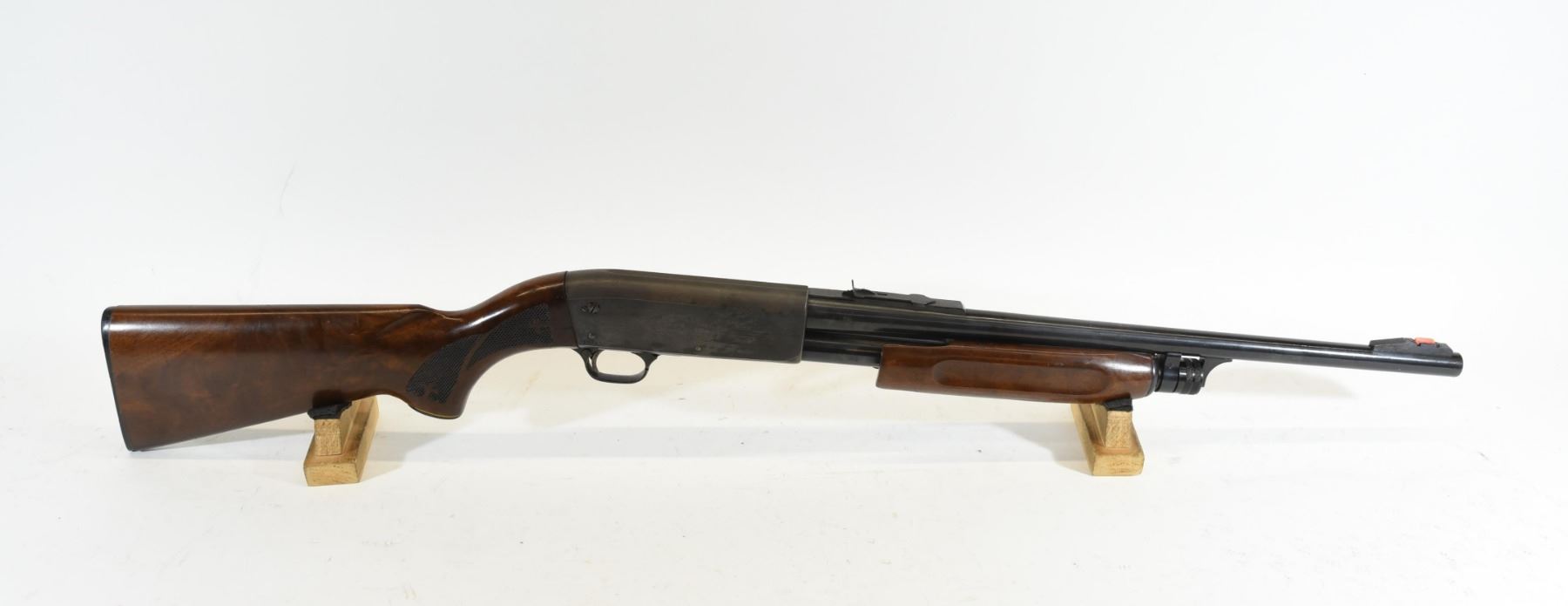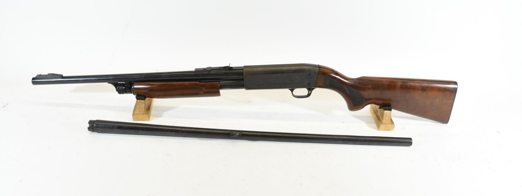 Non-Restricted, pump action, 16ga x 2 3/4", 18" Deerslayer barrel and 28" waterfowl barrel, SN 1024037. Wood stock is in good condition with a few small scratches and chips in finish, bluing is fading and rusting on the action and has several patches of rust speckling on deerslayer barrel. 28" Bird barrel is lightly rusted down left side and down the rib. Bore of deerslayer barrel is scratched and lightly pitted. Bore of bird barrel is very good.