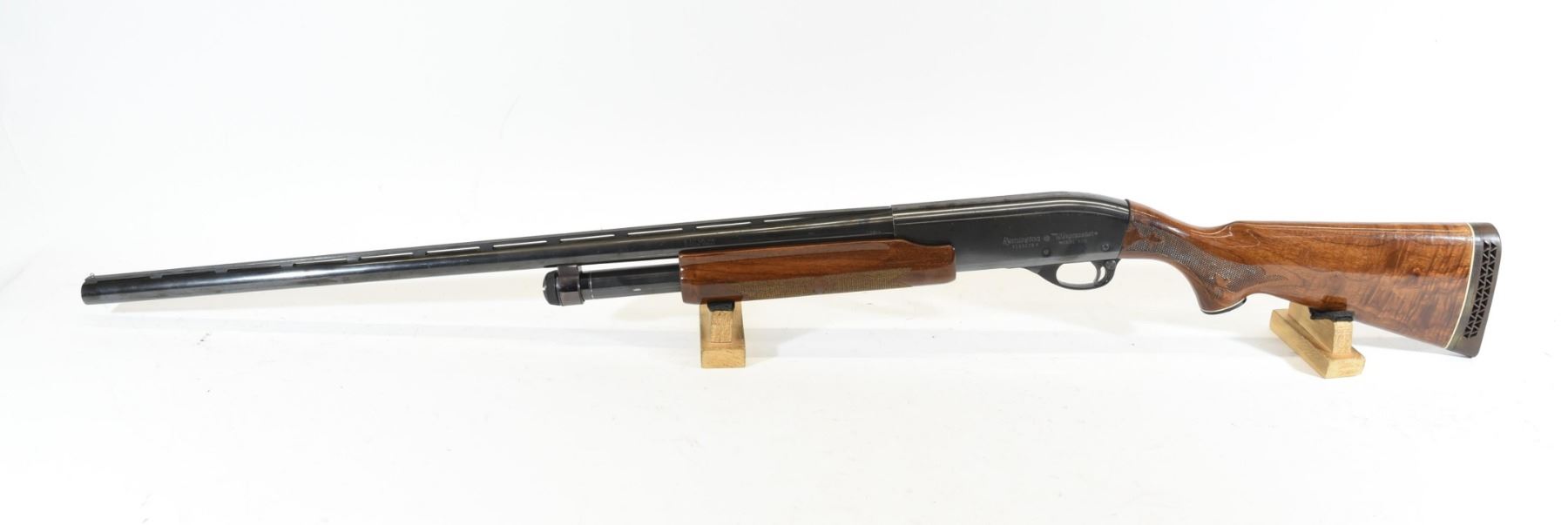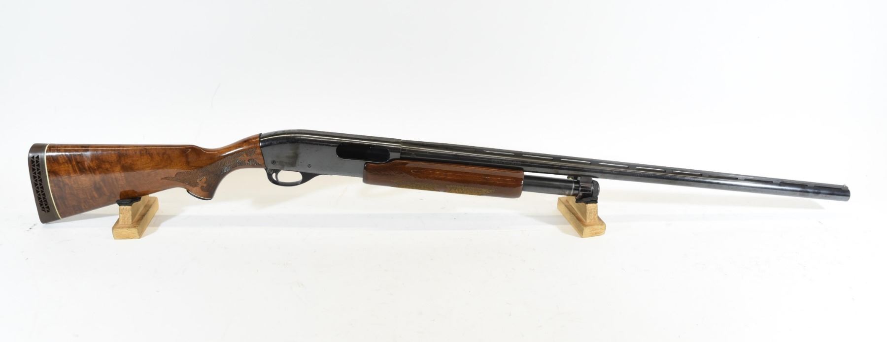 Non-restricted, pump action, 12GA x 2 3/4", 28" barrel with fixed modified choke. SN V155226V. Wood has some scratches, bluing lightly pitted all over, bore excellent.