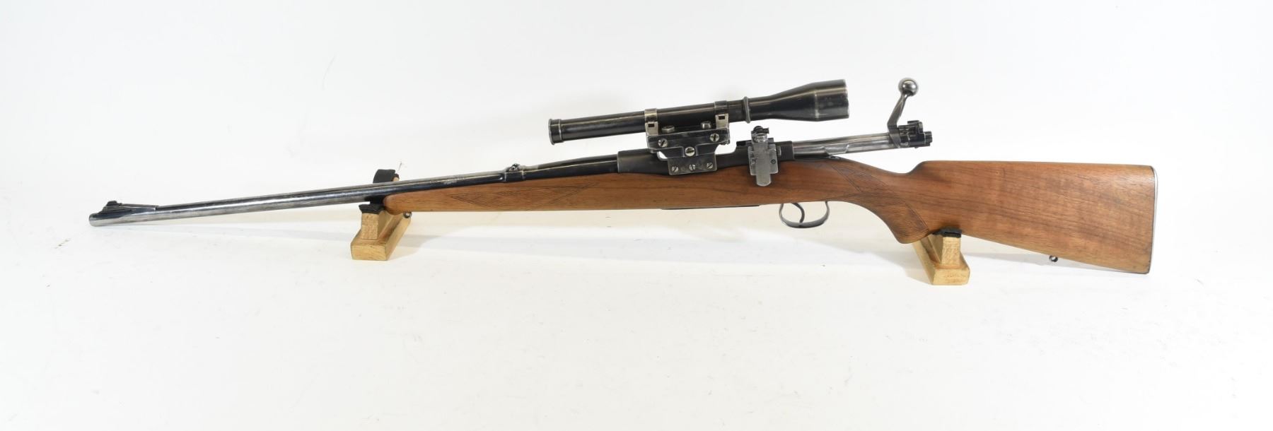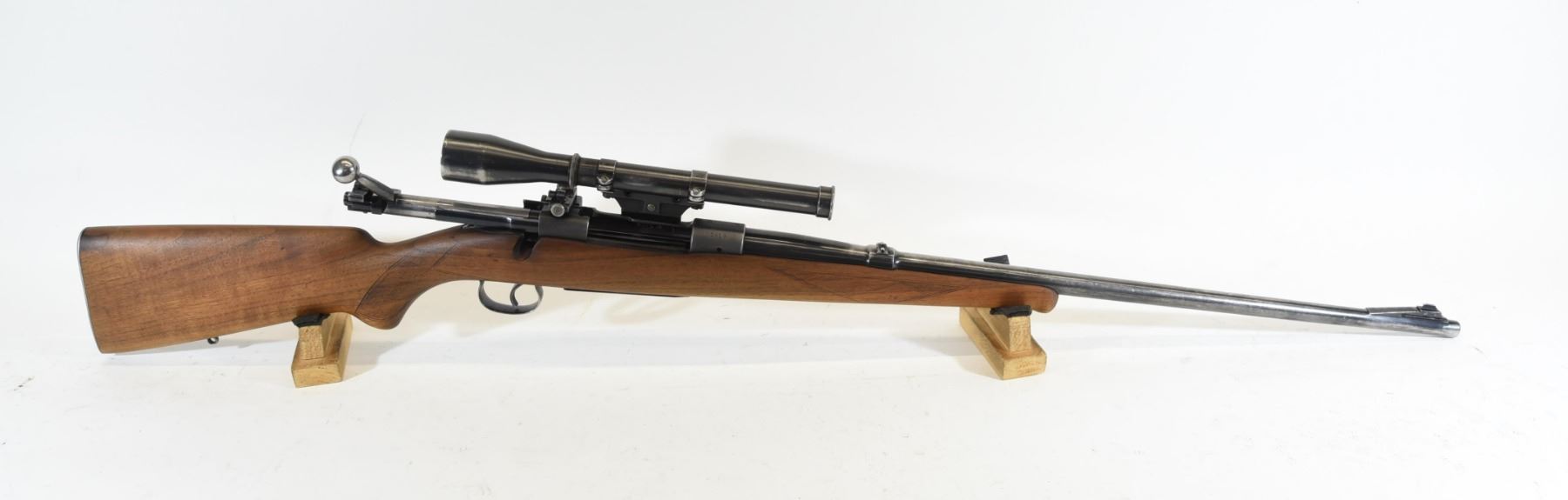 Non-restricted, bolt action, 30-06 SPrg, 24" barrel. SN 3419. Wood refinished removing most of the checkering, bluing turning grey, bore very good. Comes with side mounted scope and see thru rear peep.