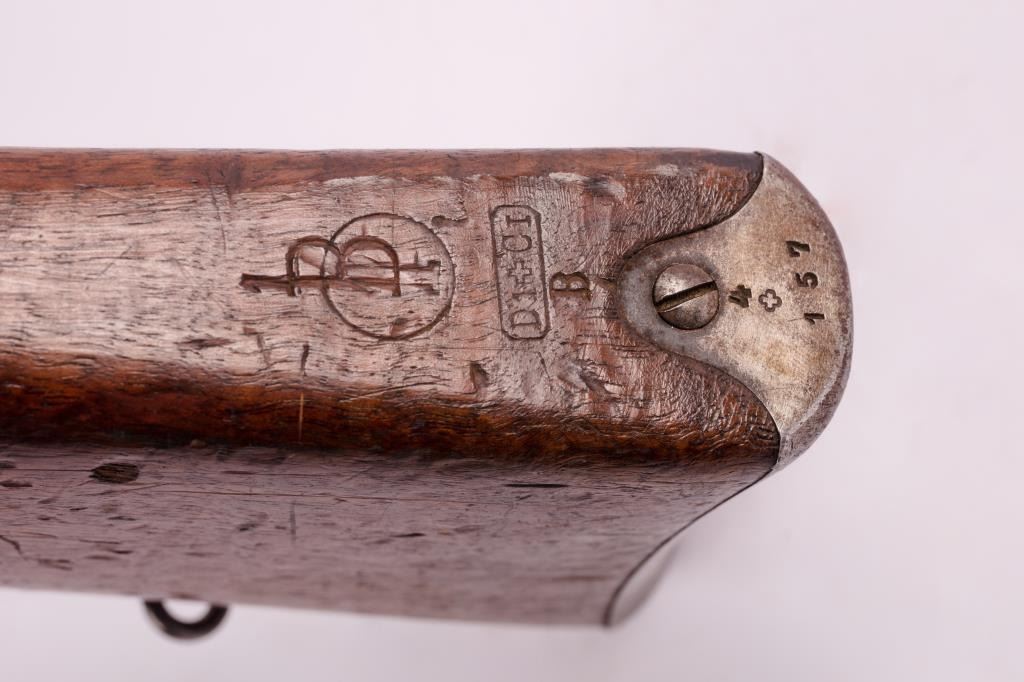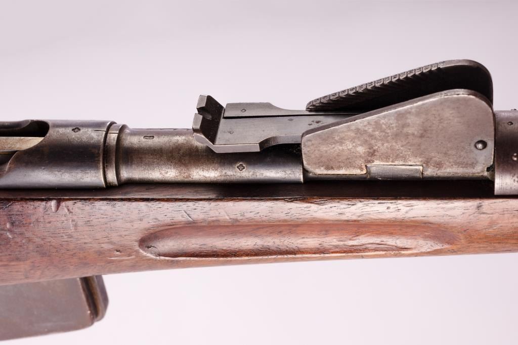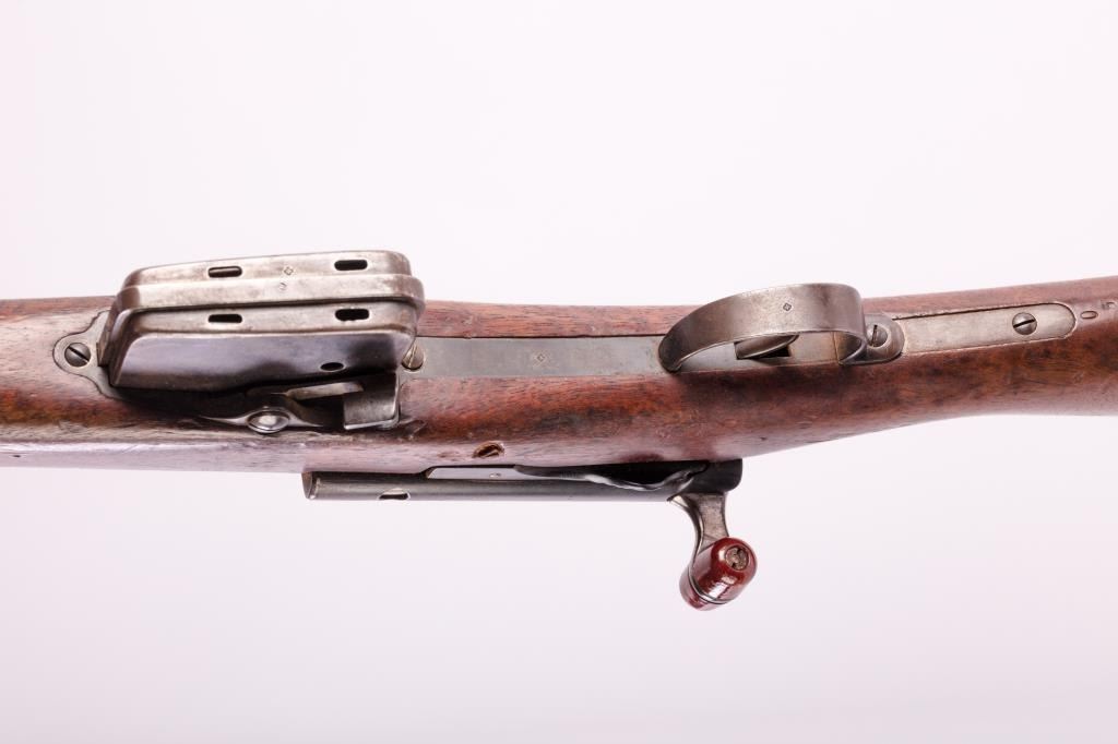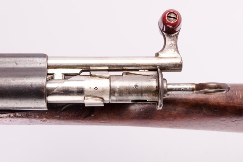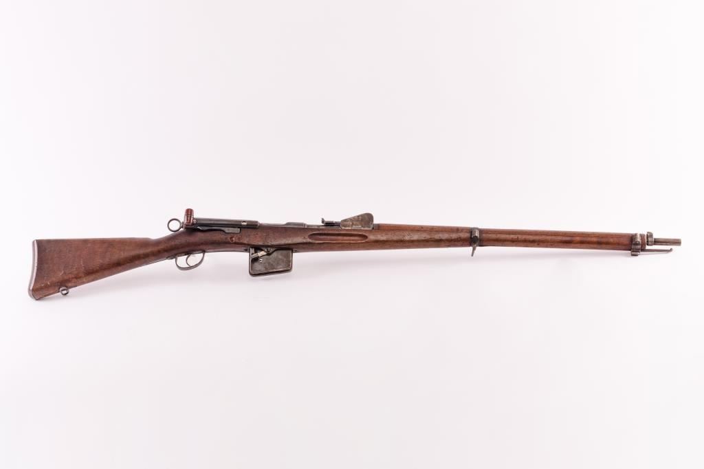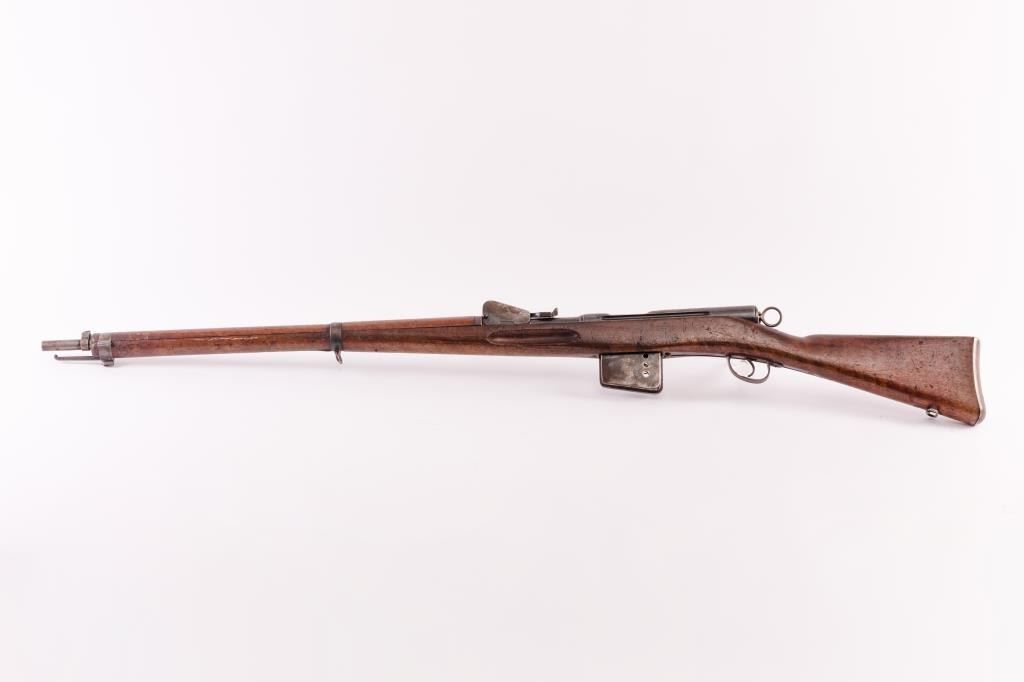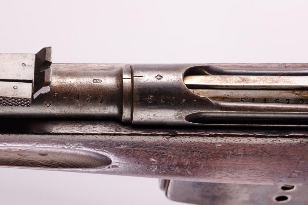 Pre-1898 Schmidt Rubin 7.5 Swiss caliber straight pull military rifle with arsenal markings, S/N 54157. Good issued condition with 50% plus finish and minor stock dings and mars. Matching visible numbers and stockcartouches. Bright bore. As issued. (Antique) Est.: $350-$700
