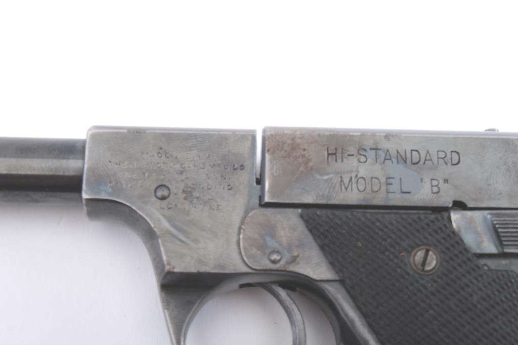 Scarce Hi-Standard Model B, 22 Long Rifle Semi-Auto Pistol S/N 90741 with 6” barrel. In vintage wood case, has 50-70% original blue with some rust and erosion. Has good grips, bright bore, no mag and overall needs somecleaning and TLC. Comes from Estate. Est.: $250-500