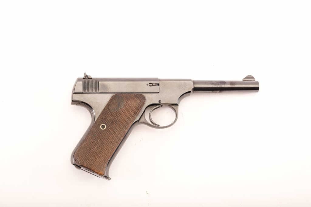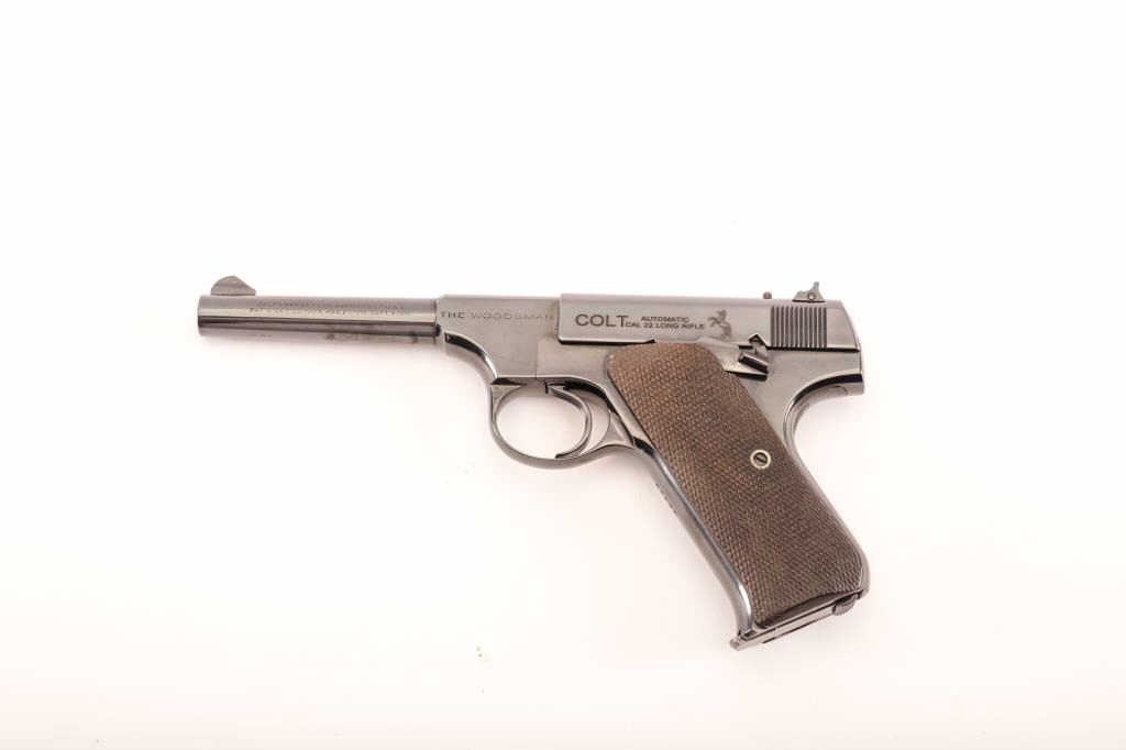 Colt Woodsman 22 Cal 4” barrel, S/N 91821. Made in 1934 shows excellent quality refinish with very good grips and woodsman marked magazine. The bore is bright. This one fooled a top collector who bought it as mint. Est.: $500-1,000
