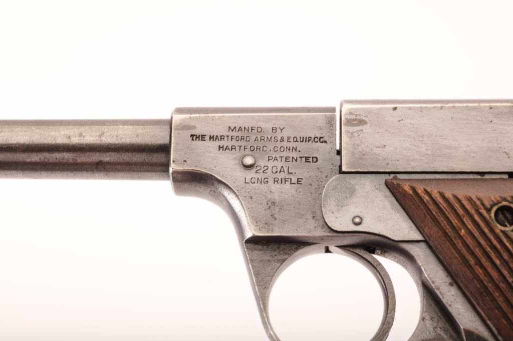 Hartford Arms Co. 22 Cal Semi. Auto pistol S/N 4896. With 6” barrel blued finish, and grooved wood grips. Shows 75-85% original blue with good markings and 2 tone correct magazine. Pre-Colt Woodsman early collector’s auto. Est.: $350-700