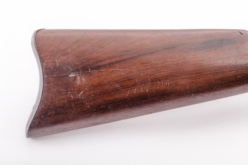 Marlin Model 92 lever action rifle in .32 rimfire caliber with 24” round barrel, full mag, rifle butt, S/N 428667. Good to very good overall with blue turning brown, minor pitting and erosion. Good sound wood, goodmarkings, good action and the bore is good. Would improve with T.L.C. and light cleaning. Out of attic. (C&R) Est.: $400-$800
