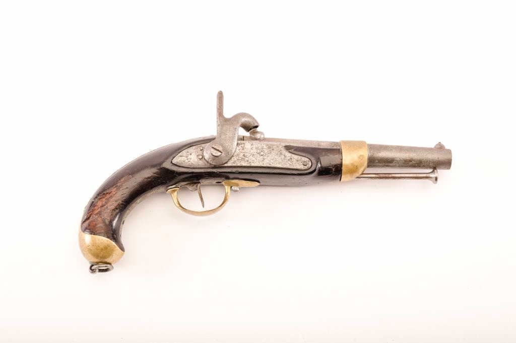 French Napoleonic era flintlock cavalry pistol converted from flintlock to percussion with brass mountings. Pitted and cleaned with partial lock markings visible. The stock has been worn with some damage. Fairoverall. Civil War. (Antique) Est.: $300-$600
