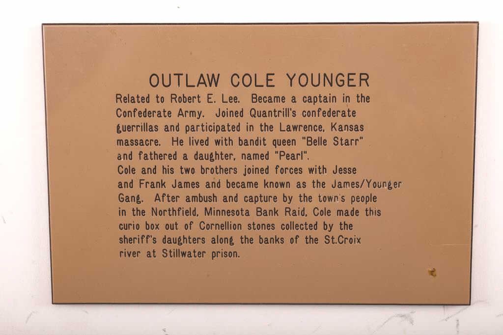 Lot consisting of a framed cabinet photo of the 3 Younger brothers and sister on card marked “J.M. Kuhn/Stillwater, Minn.” And a small wood curio box approximately 8” x 5” x 4” overall and covered with stones;accompanied by a display note: “OUTLAW COLE YOUNGER with history of Cole Younger’s exploits ending with “Cole made this curio box out of Cornellion stones collected by the sheriff’s daughters along the banks of theSt. Croix river at Stillwater prison”. No further documentation other than receipt from noted dealer Floyd Everhart who sold items to our consignor in 1983. Est.: $500-$1,000.