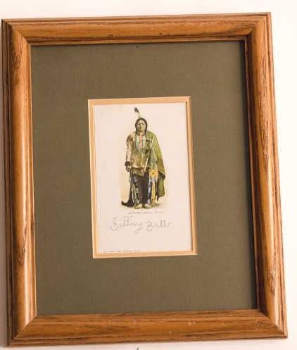 Framed, matted and signed cabinet card of Sitting Bull, Sioux warrior and Chief, approximately 12” x 9” overall and in very good condition; accompanied by an informational letter and Certificate ofAuthenticity from Little John’s Antique Arms dated April 7, 2001, noting the photographic print is by E.C. Kropp, Milwaukee, No. 231, hand signed by sitting Bull and the type of souvenir item that Sitting Bull would havesigned for a charge while participating in Wild West exhibitions and shows and other commercial engagements. From the C.T. Otis collection. Mr. C. T. Otis was one of the inventors of the elevator and a manufacturerand inventor of note. His descendants were very prominent in California turn-of-the-Century society and were noted benefactors to the arts, museums and other philanthropic enterprises”. Est.:$750-$1,500.