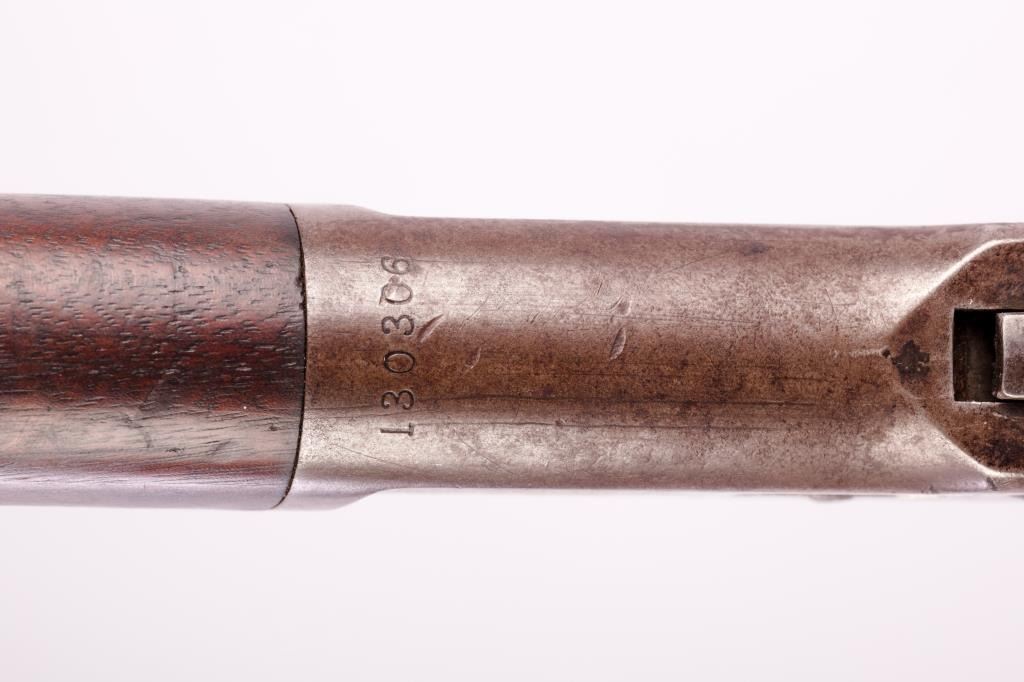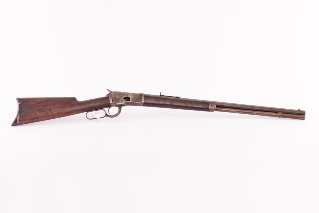 Winchester Model 1892 lever action rifle, .44 W.C.F. caliber, 24” octagon barrel, blued finish, wood stocks, S/N 130306; overall fair condition with considerable muted blued finish remaining on barrel, loading tube andreceiver gone to brown patina, worn bore, crisp action, good markings and fair wood stocks showing scattered old mars, dings, scratches and two small repairs to the top front of the wrist area; missing loading port cover. Would benefit from a careful cleaning and oiling and replacement of loading port cover. (C&R). Est.: $400-$800.