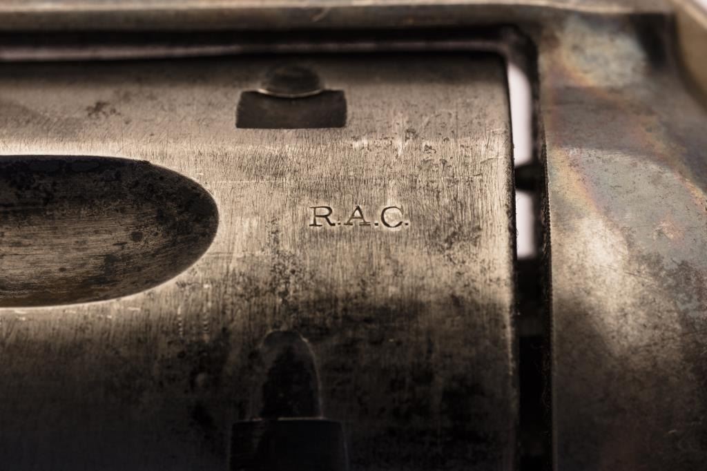Colt U.S. SAA revolver, .45 caliber, 7.5” barrel, blued and case hardened finish, wood grips, S/N 21973; R.A.C. inspected “mystery gun” as out of the proper S/N range for R.A.C. guns; shows all matching numbersincluding italic barrel address with early boss and stud for early ejector rod housing; R.A.C. on frame, top of trigger guard over S/N, on frame and bottom of barrel; no inspection on grips; .45 CAL on left reartrigger guard, two line early patent dates; 50-70% original finish with excellent interior; crisp action, sharp markings and very good + bore. Definitely should be further researched! (Antique).Est.: $3,000-$6,000.