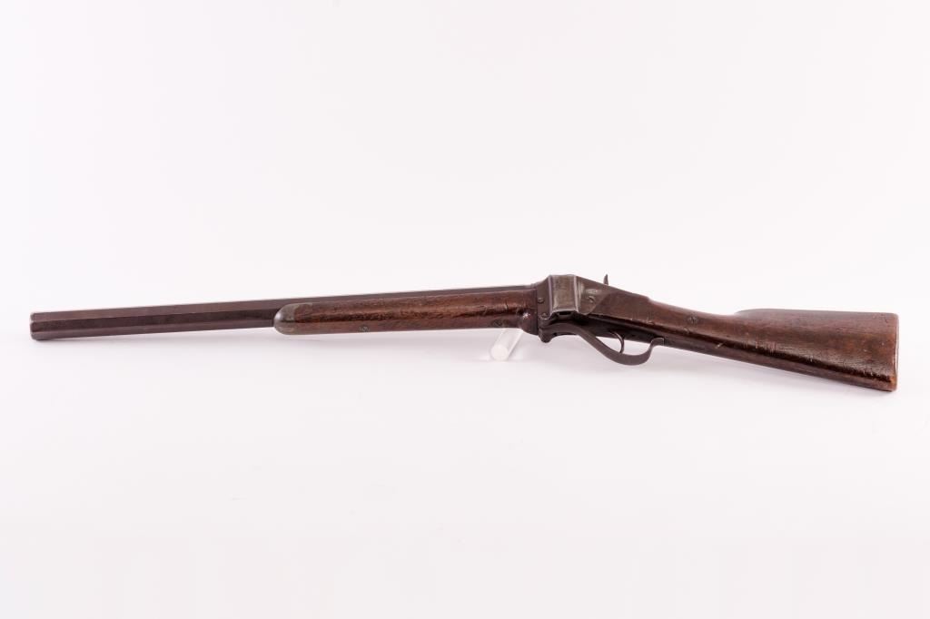 Classic period cut-down Sharps Model 1874 Sporting rifle, .44 caliber, 2-5/8” case, single trigger, 21.5” octagon barrel (35.5” overall with period cut-down butt stock), rear sight long missing, S/N C54053; overallun-cleaned good condition with even brown patina, crisp action, good bore and good wood showing scattered old wear and scratches with pewter forend tip. Accompanied by a 1990-dated factory letter with greatdestination: invoiced on October 26, 1875, to J.A. Lober of Plum Creek Station, Nebraska with notation of original barrel length of 30”. A great looking early Sharps that could have been used to shoot buffalo from theback of a horse, a lawman’s maneuverable big gun to deal with “badmen” visiting the town or as an express gun on the early Union Pacific railroad line that went through the “Station”. (Antique). Est.:$4,000-$8,000.