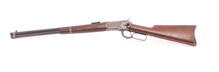 Winchester Model 92 lever action SRC, .44 W.C.F. caliber, 20” barrel, blued finish, wood stocks, S/N 890365; overall good to very good condition with majority of original blued finish remaining on barrel and loadingtube, grey/brown patina on receiver mixed with traces of original blued finish in protected areas, crisp action, sharp markings, good bore, and good wood stocks with butt stock showing scattered mars andscratches from carry and storage. (C&R). Est.: $1,750-$3,500.