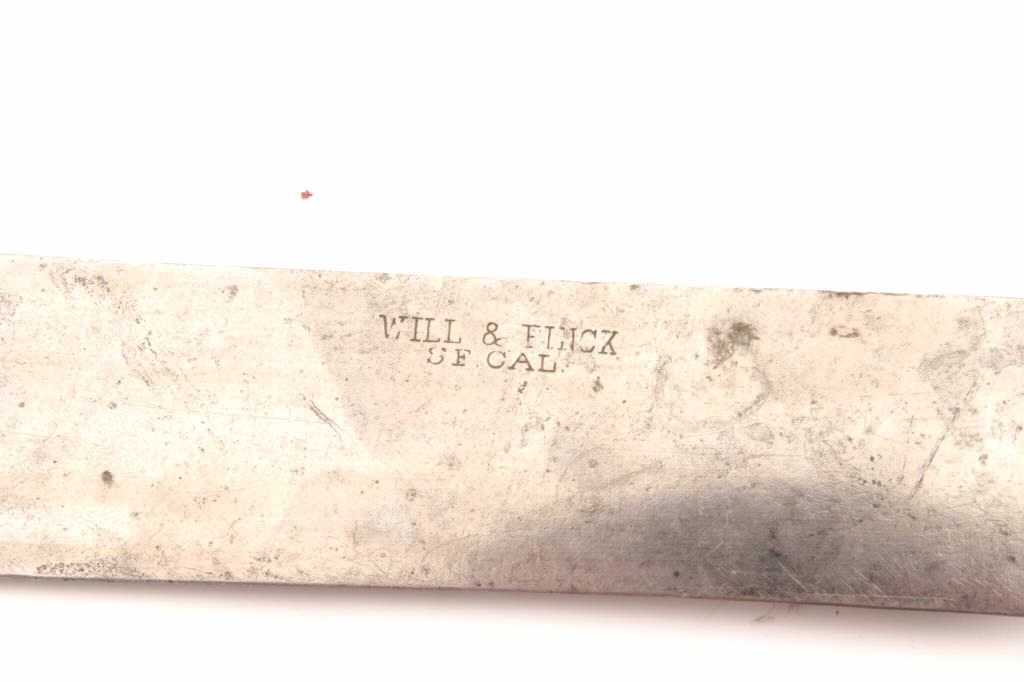 Large knife with staghorn grip and thin flexible steel blade marked “Will and Finck, S.F., Cal” measuring 14 ½” overall with a 9 ½” blade secured with pewter ferrell where blade meets hilt. Original thick patternedleather scabbard with loop for belt on back. Good to very good overall condition. Circa 1860-70s. Est.: $2500-$5000