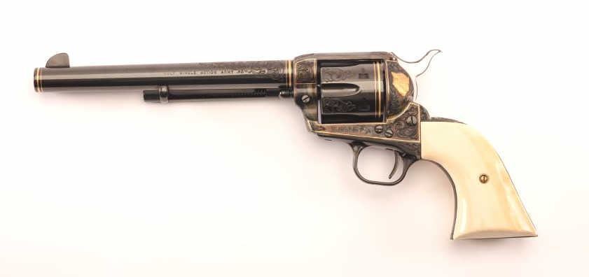 Colt Single Action Army United States Animal Special Edition Wyoming revolver, .45 caliber, Serial #92898SA. The pistol is as new in the factory fitted wooden case. The pistol features a 7 ½” barrel with gold bands at the muzzle and in front of the cylinder, A Grade engraving and vivid case colors on the frame. The pistol is factory engraved with gold inlay including a great buffalo head at the left rear of the action. Thepistol has nice smooth ivory grips. The lot includes a factory letter dated April 22, 1982 indicating the pistol was shipped on March 20, 1978 to Fin Feather Sport Shop in Omaha Nebraska. The letter confirms allfeatures and notes the Walnut presentation case with plaque inscription: “Western States Animal Special Edition Wyoming 1 of 1”. The letter further remarks, the firearms special features including two gold barrelbands, two gold cylinder bands, gold outline on frame, numbers 1 of 1 inlaid in gold and a gold inlayed buffalo. The Walnut display case is in very good condition with burgundy velvet interior. Est.: $4,000-$8,000.