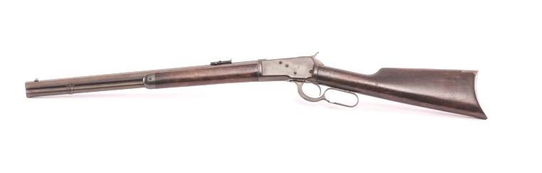 Winchester Model 1892 lever action short rifle, .44 W.C.F. caliber, 20” octagon barrel, brown patina to metal surfaces, wood stocks, S/N 622040; overall good to very good condition with a crisp action, very goodmarkings, overall good bore and good wood stocks that may have seen an old re-finish; a scarce short rifle made circa 1911. (C&R). Est.: $1,200-$2,400.
