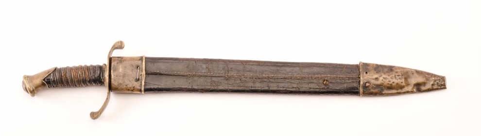 Thomas Leech & Co Memphis Novelty Works short sword or Bowie marked “Emphis” on back of guard (Memphis). Measures 22 ½” overall and 17 ½” blade. Single wire wrapped grips and Confederate style blood groove. “Yellow”alloy brass of right confederate color. 1 of only 2 known to collectors. The scabbard is of the period but associated by former owner and is an excellent marriage. Minor restoration to grip. A rare opportunity toobtain 1 of 2 authentic specimens which experts agree is an authentic and rare confederate Bowie. Est.: $7,500-$15,000