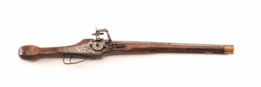Wheelock Cavalry style petronel with 21” barrel of .62 caliber smoothbore and 31 ½” overall. Nicely engraved lock and traces of “Black” finish on stock. Bone fore end cap and ramrod tip are the originals. The lock is intact and working. Circa 1600-1620. (Antique) Est.: $4,000-$8,000