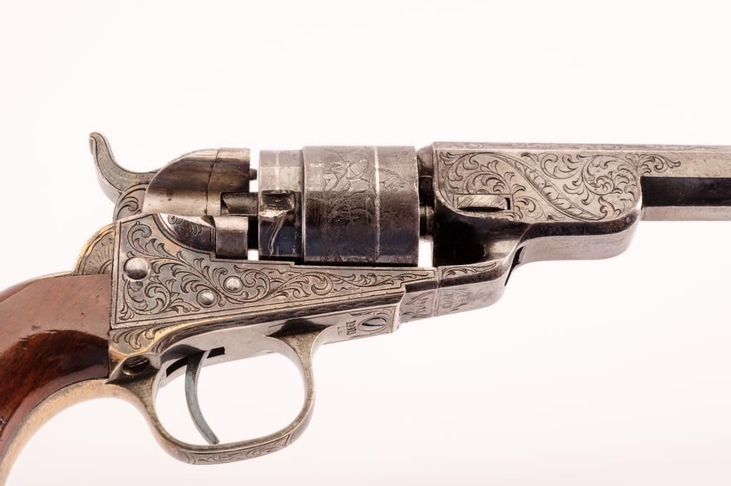 Colt .38 rimfire Pocket Navy conversion finely open vine scroll factory style engraved, blue and case colored finish, select varnished grips, S/N 19913 I. E. with 4 ½” plugged barrel using percussion parts.This revolver shows finely cut open vine scroll with 80%-90% bright blue and case colors remaining. The select varnished wood grips are excellent. The hammer shows insertion of firing pin through engravingindicating engraved as percussion and most likely never sold by factory until converting. The grips fit impeccably and are original to this Colt. Minor scratches and normal aging. Crisp action and bright bore.All matching including cylinder. Very few original engraved conversions are encountered with the desirable blue and case colored finish. (Antique) Est.: $5,000-$10,000
