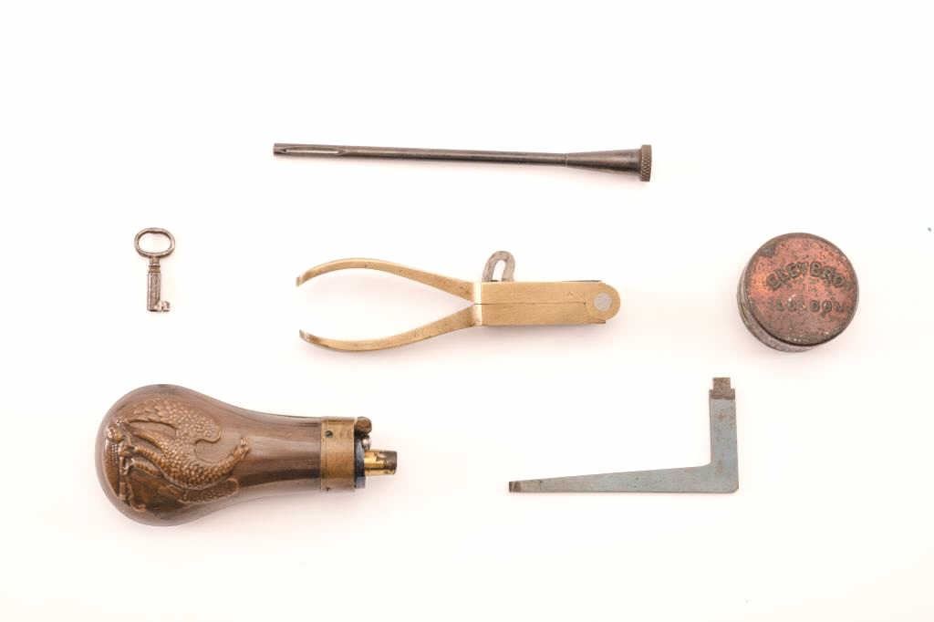 Colt 2nd Model .28 caliber Root Revolver remaining in fine to excellent original condition and in its original case with accessories, S/N 16875. This revolver retains 90%-95% original bright blue with most casecolors on hammer and lever only slightly muted. The cylinder pin and small parts show bright original colors. The box is very good plus to almost fine showing some slight wear at contact points. Excellent flask, mold,root tool with brilliant blue and rod and cap tin. Exterior of the box is also very good plus to almost fine. An exceptional set that would be difficult and expensive to improve upon. (Antique) Est.: $4000-$8000