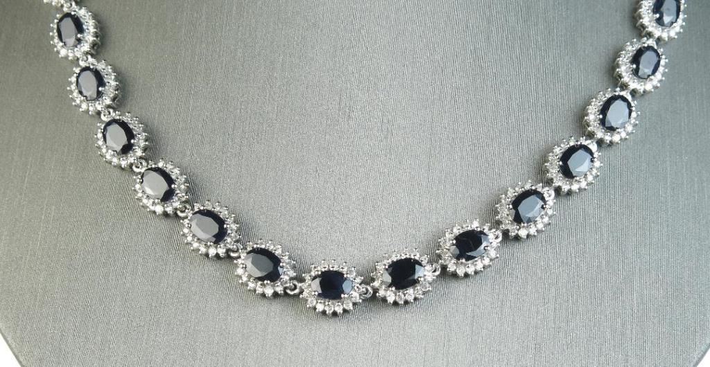 Luxury Statement Piece Blue Sapphire and Diamond Necklace featuring 38 oval Blue Sapphires between 0.80 -1.00 carat each weighing approx. 30.00-40.00 carats total accented with over 665 full cut Diamondsweighing approx. 7.00-9.00 carats total with G-H colors and SI/I clarity set in 14 karat combination yellow and white gold setting. Retail $20,000-$30,000 Estimates $12,000-$15,000