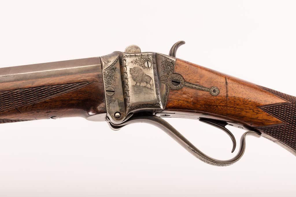 Exceedingly desirable and rare engraved Freund Alteration of a Model 1877 Sharps rifle, overall fine condition; .45-2 7/8 caliber, 28” half-round/half-octagon barrel, stamped with Freund patent dates near breech, S/N 202. Overall fine condition with majority of original browning on the barrel and considerable original case colors on the action and lever; checkered deluxe walnut stocks are overall fine; described in detail and photographed by the late F. J. Pablo Balentine in his book “Freund & Bro; Pioneer Gunmakers To The West” (page 347) “. . . Freund altered camming action breechblock, double extractors. Right side of receiver has engraved Indian holding drawn bow, bull buffalo on left side; “Freund Patent, Wyoming Armory, Cheyenne, Wyo. Ter.” on lockplate, entwined initials “W.D.” on tang near breech for W. T. Dawson, editor of “American Field” magazine. Elaborately engraved receiver, hammer, trigger bar, tang and screws. Checkered European walnut pistol grip stock, checkered forend with ebony cap. Trigger bar extends over pistol grip. Buttplate with trapdoor containing wiping rods. Freund-marked front sight, Freund-marked converted Sharps rear sight”. This rifle was featured on the covers of January 1968 and May 1978 of American Rifleman and was covered by James Serven in his article “Frank W. Freund: Frontier Gunmaker” in the February 1970 edition of Guns magazine (copies of all three magazines included with this lot as well as a disc of the articles and numerous close-up pictures of the features of this beautiful Sharps). Also accompanying this lot is a January 7, 1991 factory letter on this rifle that covers evaluation of the gun by the late Dr. R.L. Moore who notes: “This particular gun represents a rare Model 1877 Sharps that has been modified by Frank W. Freund of Cheyenne, Wy.”; Dr. Moore confirms features and concludes his letter with “This gun may well represent the finest produced gun by Freund especially the finest Model 1877”. The exclusive deluxe nature of the rifle in addition to its historical significance to the Freund name plus its identification to W.T. Dawson, editor of “American Field” magazine makes this museum quality gun a centerpiece for the most sophisticated Sharps collector with an appreciation for history and Freund’s finest work! (Antique). Est.: $35,000-$70,000.