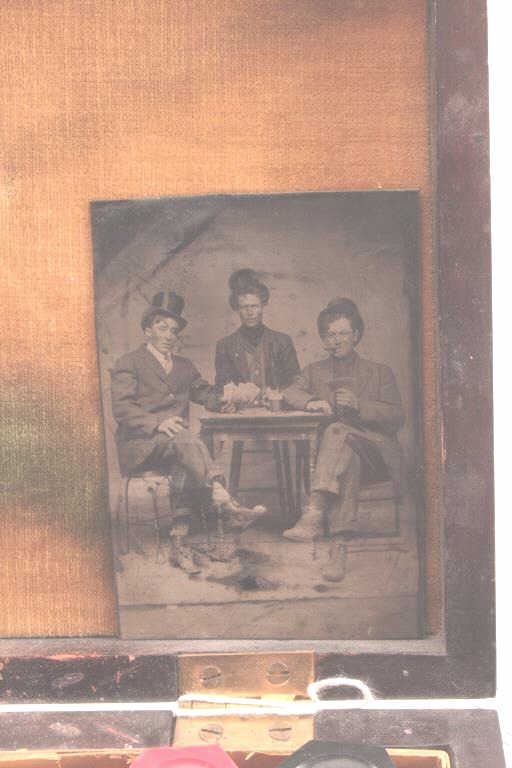 Vintage cased gambling set with cards, chips, dice and tokens. The antique wooden case is lined in green velvet and contains two decks of antique “STEAMBOAT” playing cards, dice, miniature clay poker chips and neat oldtintype depicting three gamblers in top hats at the table. The bottom of the case has an old label which reads, “PHILADELPHIA”. The case is in good overall condition with scratches and loss of finish on the top andthe key is retained. Est.: $200-$400.