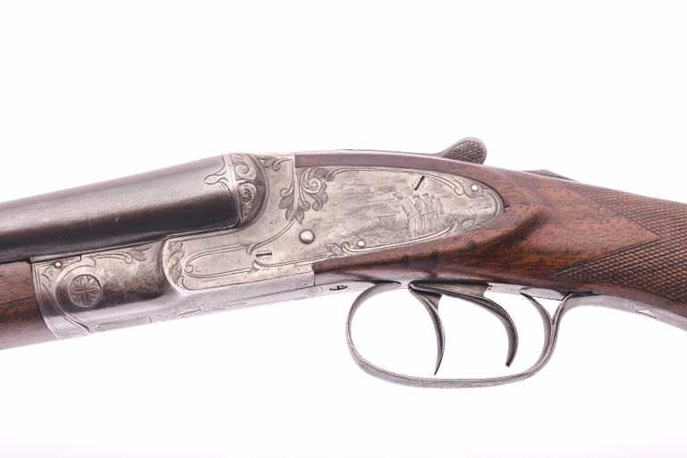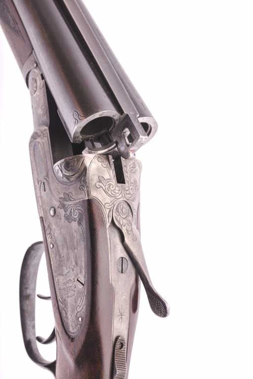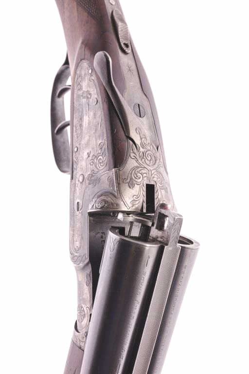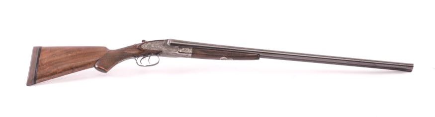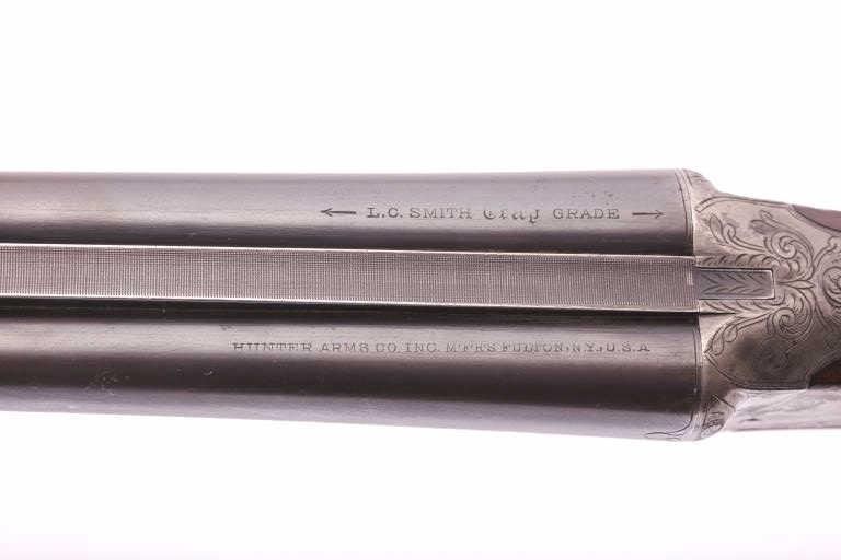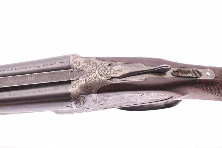 L.C. Smith Trap Grade side by side shotgun, 20 gauge, Serial #42517. The shotgun is in very good overall condition with 28” barrels with a full-length filed rib. The barrels retain a significant amount of toning bluefinish with small mars, dents and wear at the muzzle. The receiver has gone to silvered case hardening with game scenes engraved on each side, tang mounted three-way safety, double triggers and auto ejectors. Thefinely checkered wood stock is in good condition with mars, compressions and some flattening of the checkering consistent with field use. The buttstock ends with a solid rubber recoil pad providing a 13 ¾” LOP tothe front trigger. The bores are good, the action is crisp and the markings are sharp. Est.: $1,500-$3,000. (C+R).