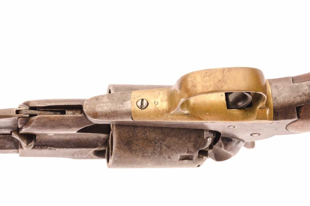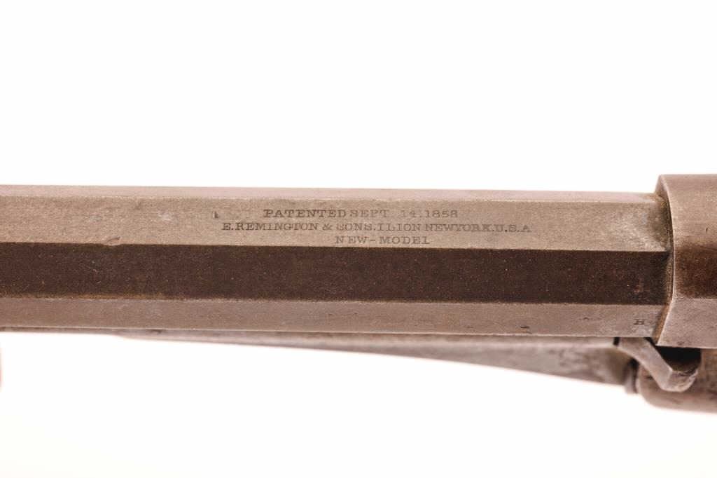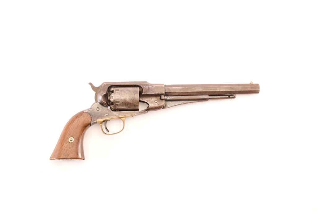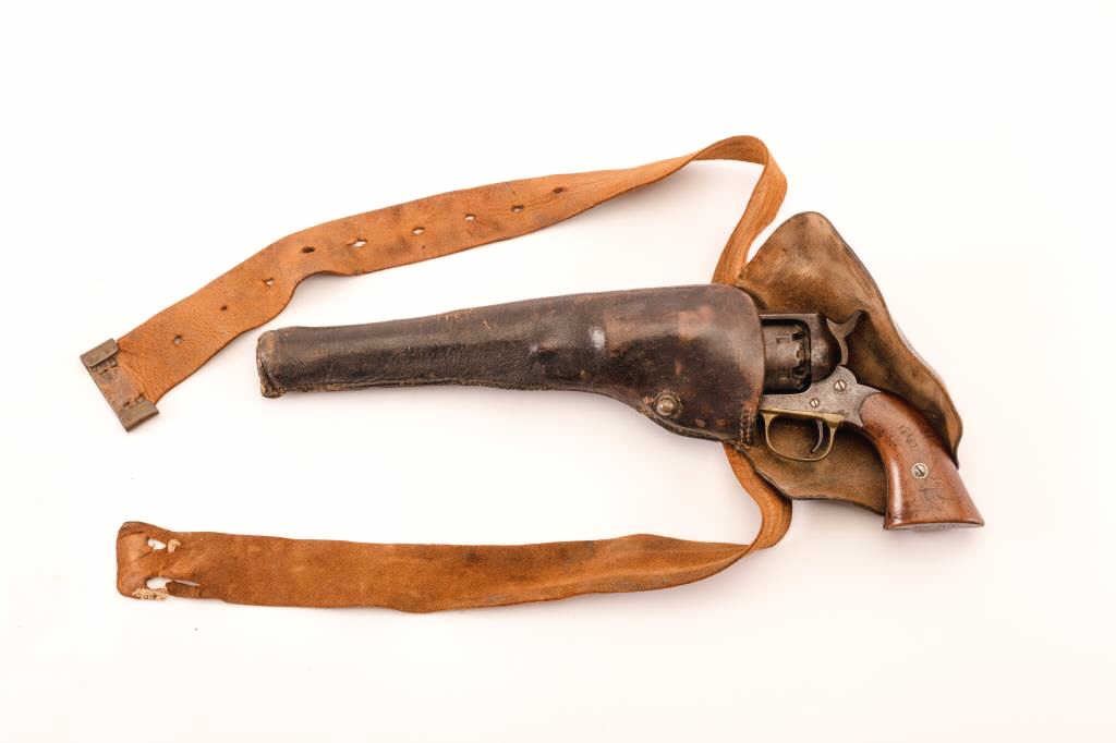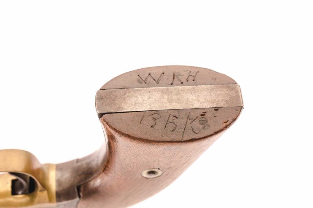 1858 Remington .44 caliber Percussion Revovler, S/N 36409 with holster, belt, buckle and extra original cylinder. As carried by family member of consignor named W.R. Harris from Nebraska and marked “W.R.H.” on butt of grips also “13 B K” (Regiment?). Uncleaned with 30%-50% original blue and visible outline of inspection. Scratched on the left grip “35 REG 18W2”. (Antique) Est.: $900-$1800