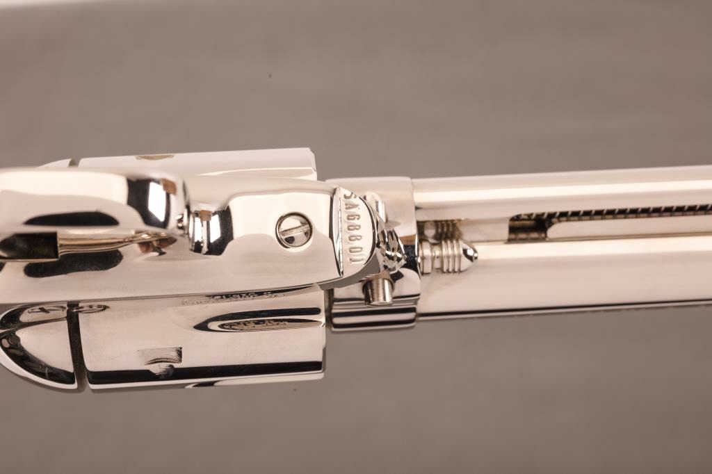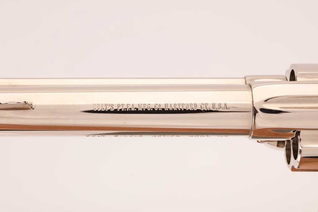 Colt SAA Revolver in .45 L.C. caliber with a 4 ¾” barrel, nickel finish, extended grip with factory checkered ebony medallion grip, S/N SA68801. Factory letter in correct box. Excellent to mint. No evidence of firing oruse. (Modern/No PPT) Est.: $2000-$4000