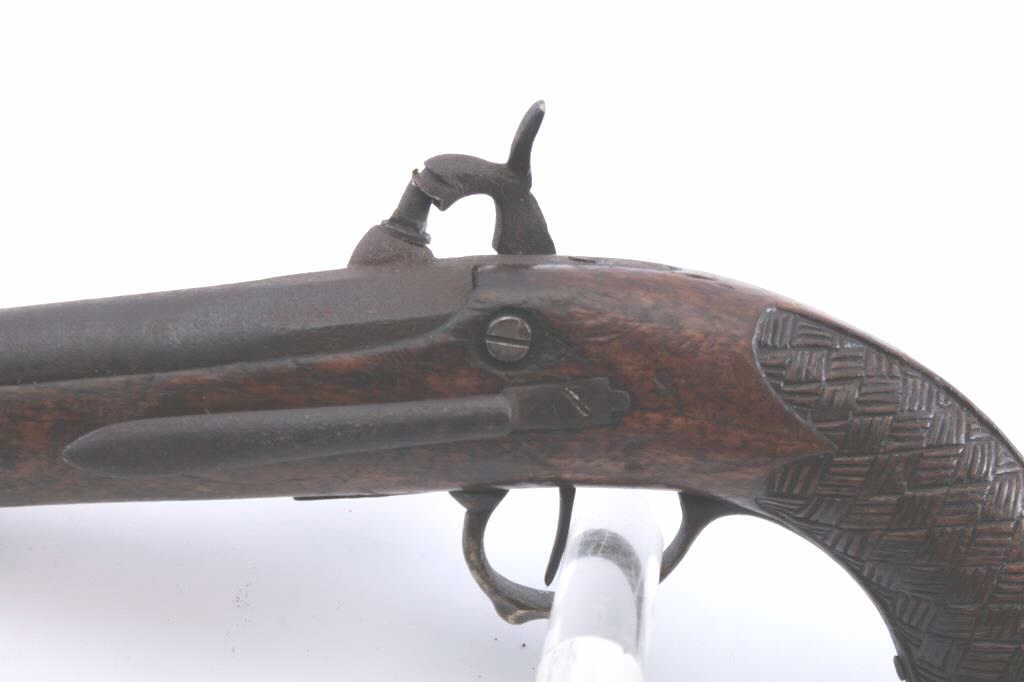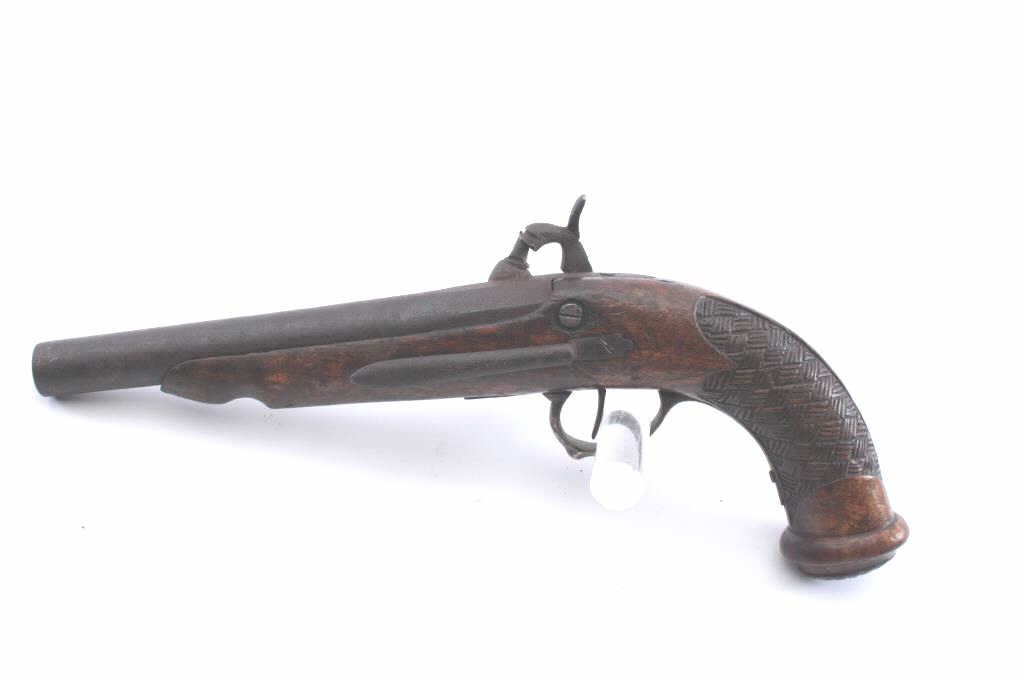 Spanish Colonial era Miquelet percussion pistol with checkered wood stock and belt hook. Measures 14” overall and .70 caliber. Crude hammer and oversize nipple converted from flintlock. Hammer screw and small partsreplaced. No ramrod. Dark patina with some rusting. Not quite working properly. (Antique) Est.: $250-$500