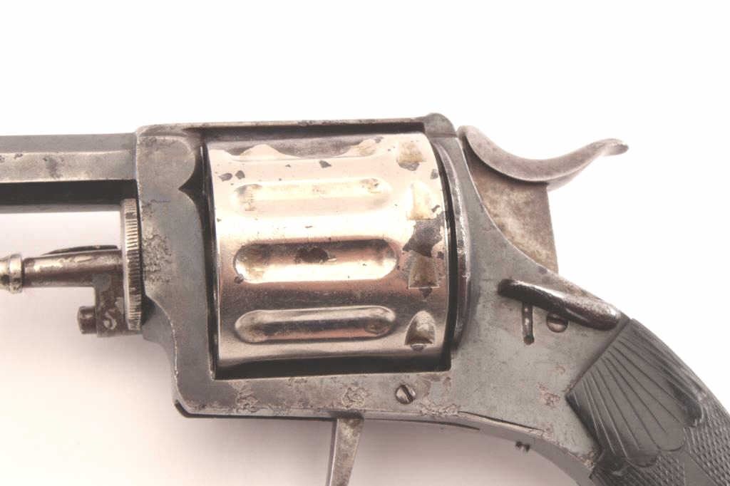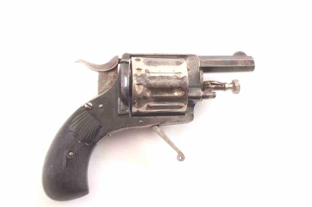 12 shot oddity revolver signed in gold on top of the frame in finely inlaid script “Metrailluse”. Measures approximately 5.5mm center fire with 2” octagon barrel, 1 ½” cylinder and nearly 7” overall. Blue and case hardened with nickel cylinder and fancy checkered ebony grips. Folding trigger with hammer safety on left side of the frame. Very good condition with 60%-80% finish showing some flaking of the nickel on the cylinderand natural aging and toning. Some minor pitting. Works well. Very probably an exhibition or display piece with this type of finish, gold inlay and rare in 12 shot in this small of size. (Antique) Est.:$900-$1800+++