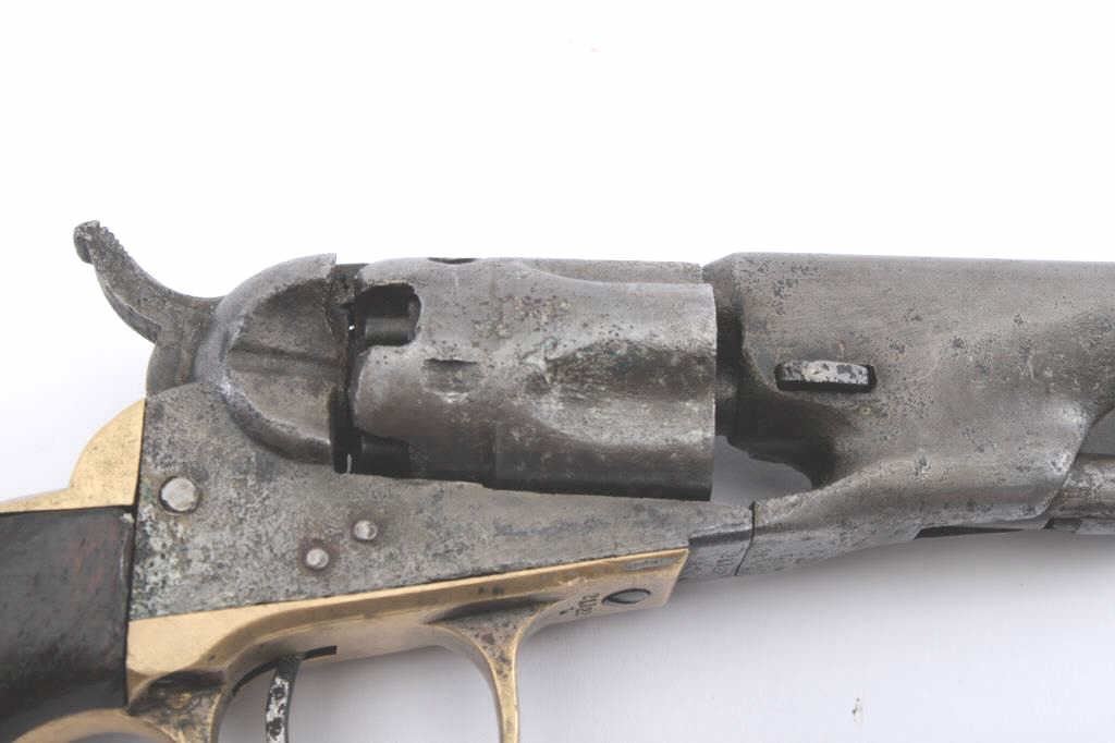 Colt 1862 Police Model percussion revolver, .36 caliber, Serial #21322L. The pistol is in good overall condition with the desirable 6 ½ā barrel. The metal surfaces have gone to a uniform grey patina with areas of lightsurface erosion and pinprick pitting on the cylinder, barrel and frame. All matching visible serial numbers with the āLā for a London marked pistol that returned in time for the Civil War. The U.S. barrel addressis faintly visible under magnification, as is the Colt marking on the left side of the frame. The smooth wood grips are in good condition with small mars and a considerable amount of their original varnish. The boreis fair and the action functions. Est.: $600-$1,200. (Antique).