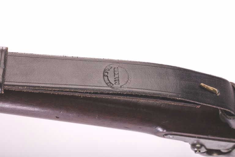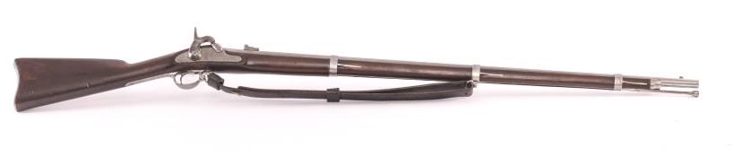 U.S. Model 1861 percussion contract rifle-musket by Trenton, lockplate and barrel dated 1864; top of barrel at breech tang stamped “B 6, wood stock stamped at top of wrist “22” and “E” on top of butt stock bybutt plate; .58 caliber, 40” barrel with “N.J.” (New Jersey) marking on left side of barrel at breech, barrel shows light grey patina, crisp action, good markings and overall good to very good full length woodstock; reproduction leather sling. (Antique). Est.: $900-$1,800.