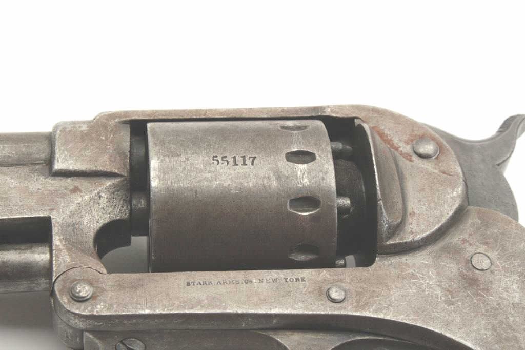 Starr Model 1863 percussion single action Army revolver, .44 caliber, 8” barrel, grey patina, wood grips, S/N 55117; good action, good markings, some scattered light surface rust from long storage, grips show wear andscattered small scratches and mars. (Antique). Est.: $400-$800.