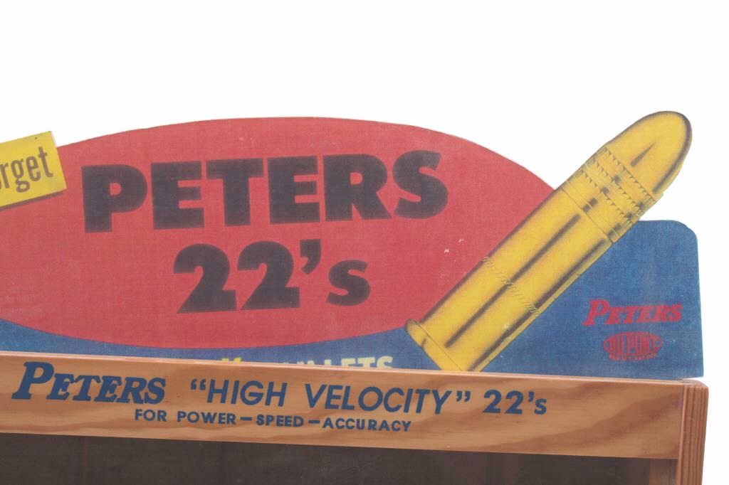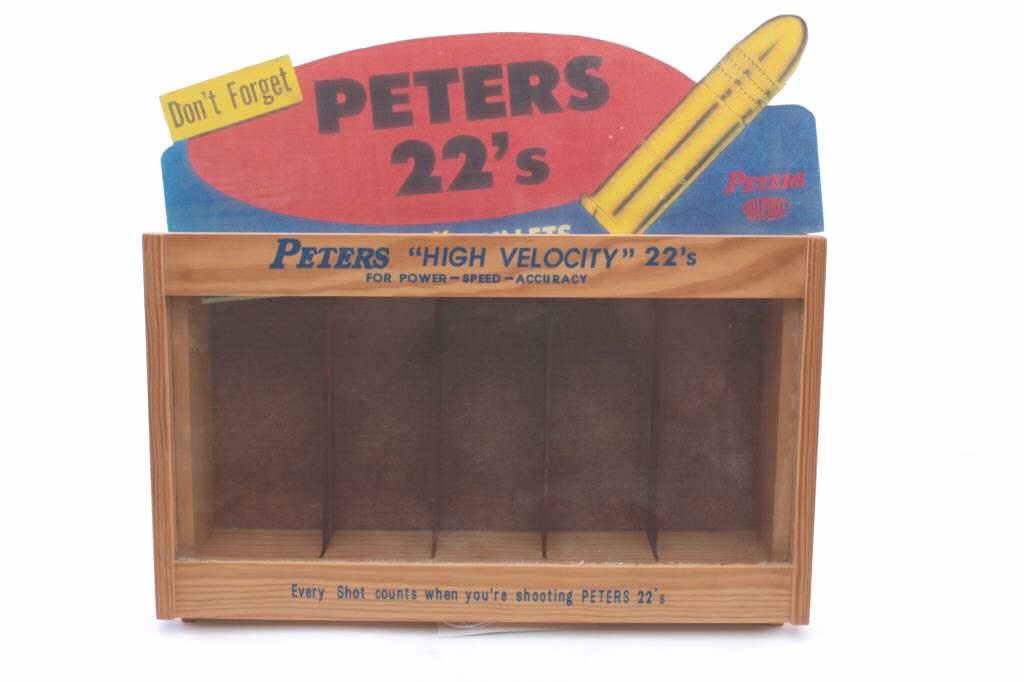 Nicely accomplished wood and glass reproduction of a Peters store countertop .22 high velocity ammo display case approximately 15” x 16” overall including the color cardboard display piece advertisingcap; overall very good to fine condition. Great accessory for the ammo collector’s display room. Est.: $75-$150.