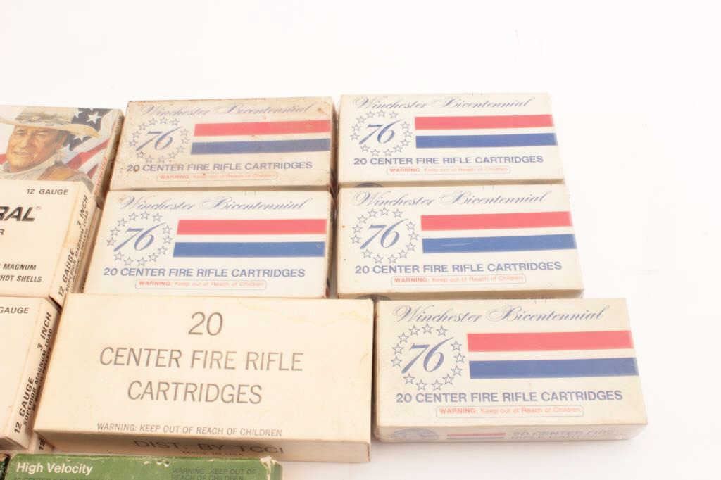 Lot of 22 boxes of misc. ammunition including 5 boxes of Winchester 1976 Commemorative .30-30 caliber, 1 box of John Wayne Commemorative .32-40 caliber; 4 boxes of Western .30-30 caliber, 1 box of WinchesterSuper Speed .30-30 caliber, 1 box of TCCI .30-30 caliber, 8 boxes of Federal 12 gauge, 3” 00 Buck Magnum shells, 1 box of Remington .45-70 and 1 box of Remington .380 Auto cartridges. Est.: $150-$250