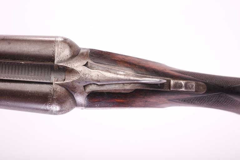 Parker Brothers hammerless damascus SxS 30” steel barrels, Grade G shotgun, 12 gauge, double triggers, checkered wood butt stock (forend missing), S/N 92123 G; brown patina to barrels, good bores, good wood stock withcheckered Parker Brothers hard rubber butt plate, action not working; parts gun. (Antique). Est.: $300-$600.