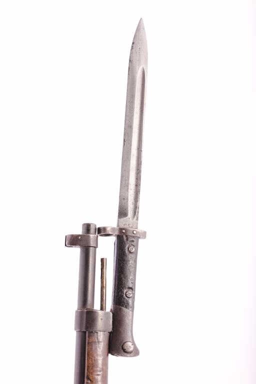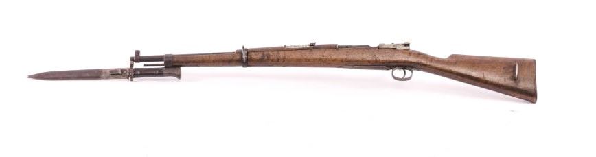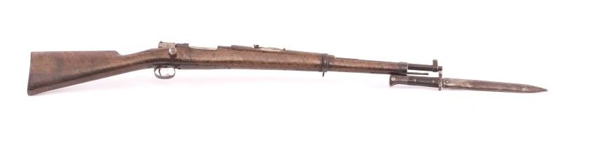 Mauser Model 98 bolt action rifle, dark patina, S/N 15862, with bayonet and metal scabbard; working action, dark bore; stock shows scattered old mars, dings and scratches and has an old repair to the top of thewrist. (Antique). Est.: $150-$300.